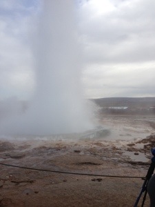 Nach kurzer Fahrt erreicht man die Geysire. Der Strokkur wirft eine 10 – 15 Meter hohe und rund 100 Grad heiße Fontäne in die Höhe.