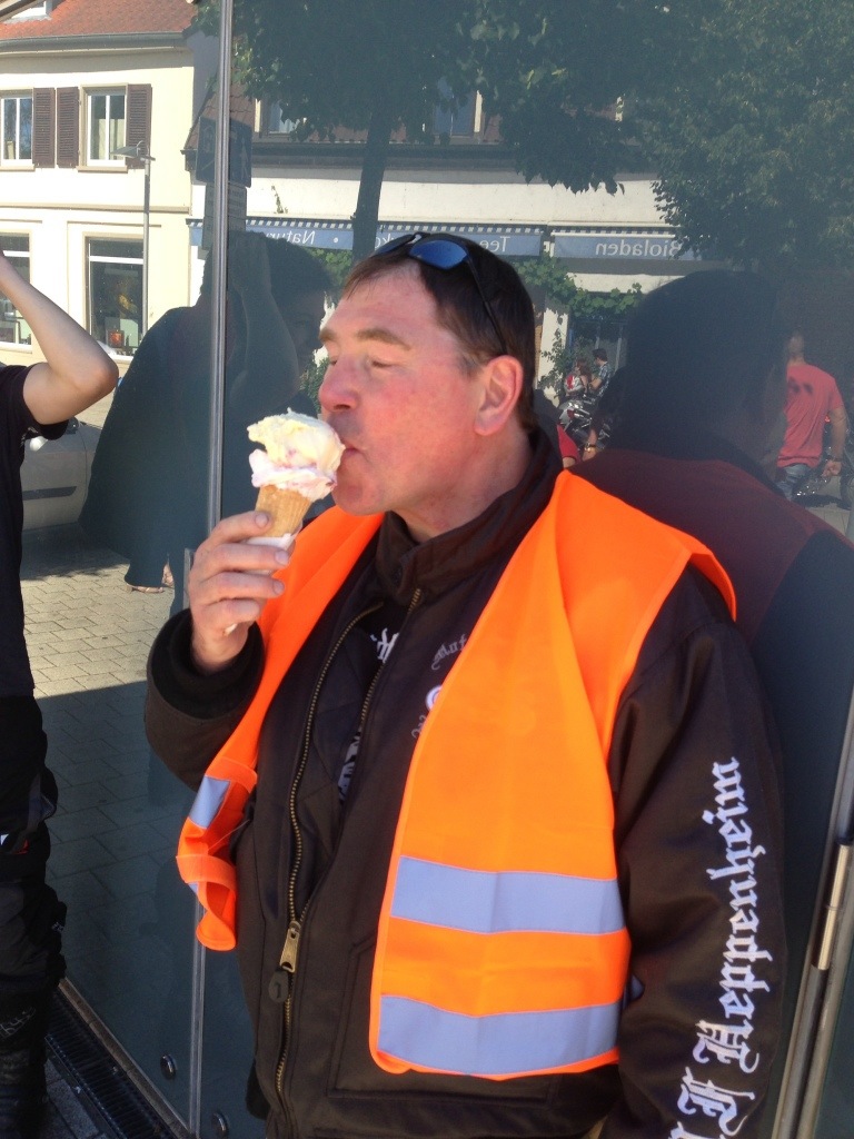 Gegen 15 Uhr machten wir uns bei 30 Grad auf den Rückweg über gemütliche Cruiserstrecken und zollten der Hitze erst in Schwetzingen Tribut. Ein Eis war bei dieser Hitze notwendig, um die letzte Wegstrecke in den alten ehrwürdigen Amtshof in der Heppenheimer Altstadt zurückzulegen.