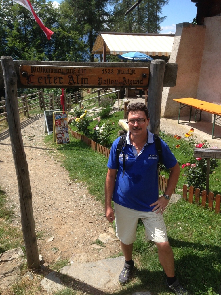 Nach dem Schreck gestern war heute Wandern angesagt. Da wir vis a vis zum Schloß Tirol wohnen wurde die Besichtigung auf dem Weg zur Talstation Hochmuth gleich mitgenommen. Gegen 12 Uhr starteten wir unsere Tour über einen schmalen Panoramaweg zur Leiteralm. Dort wurde Rast gemacht und Südtiroler Spezialitäten probiert.