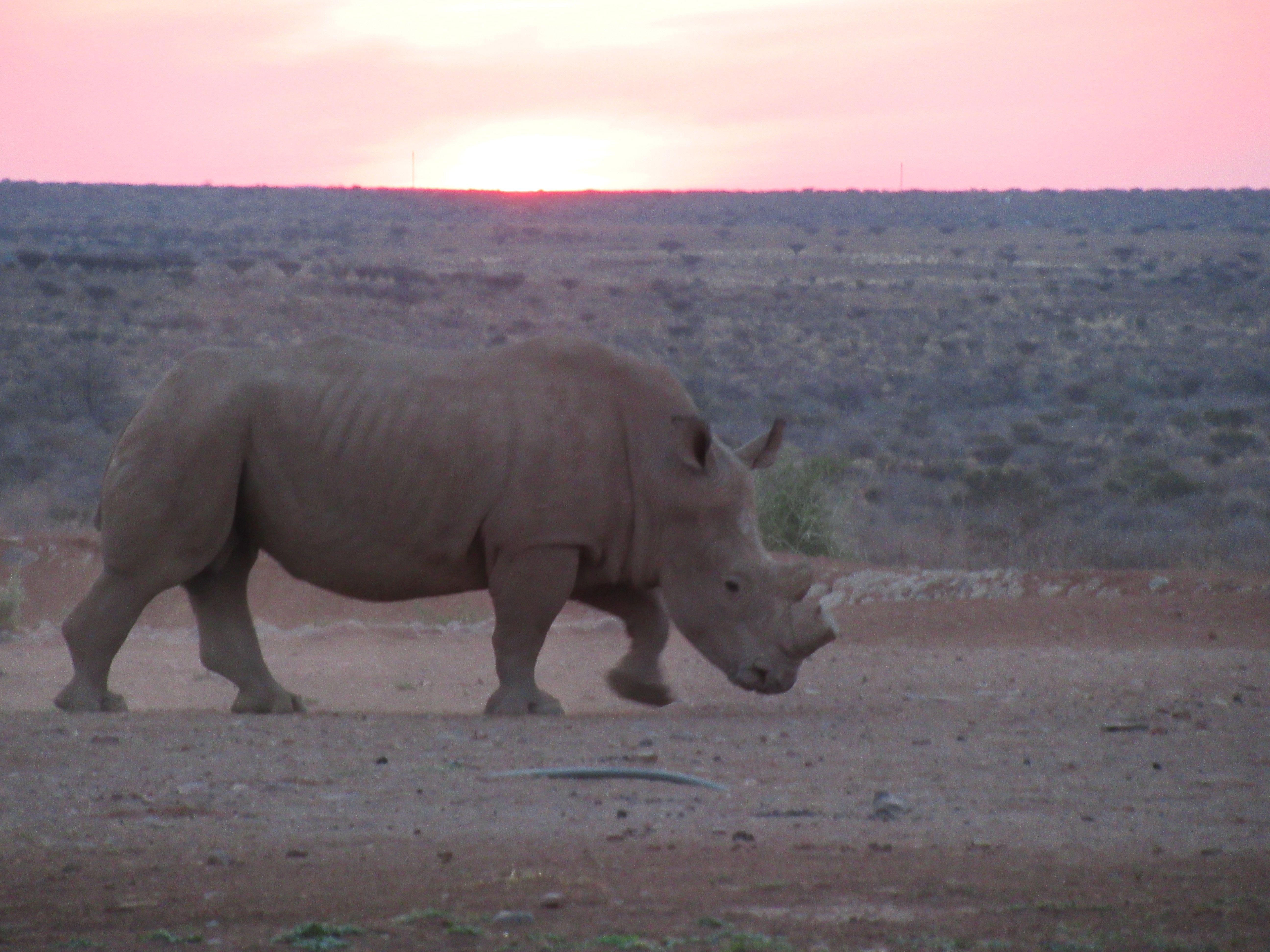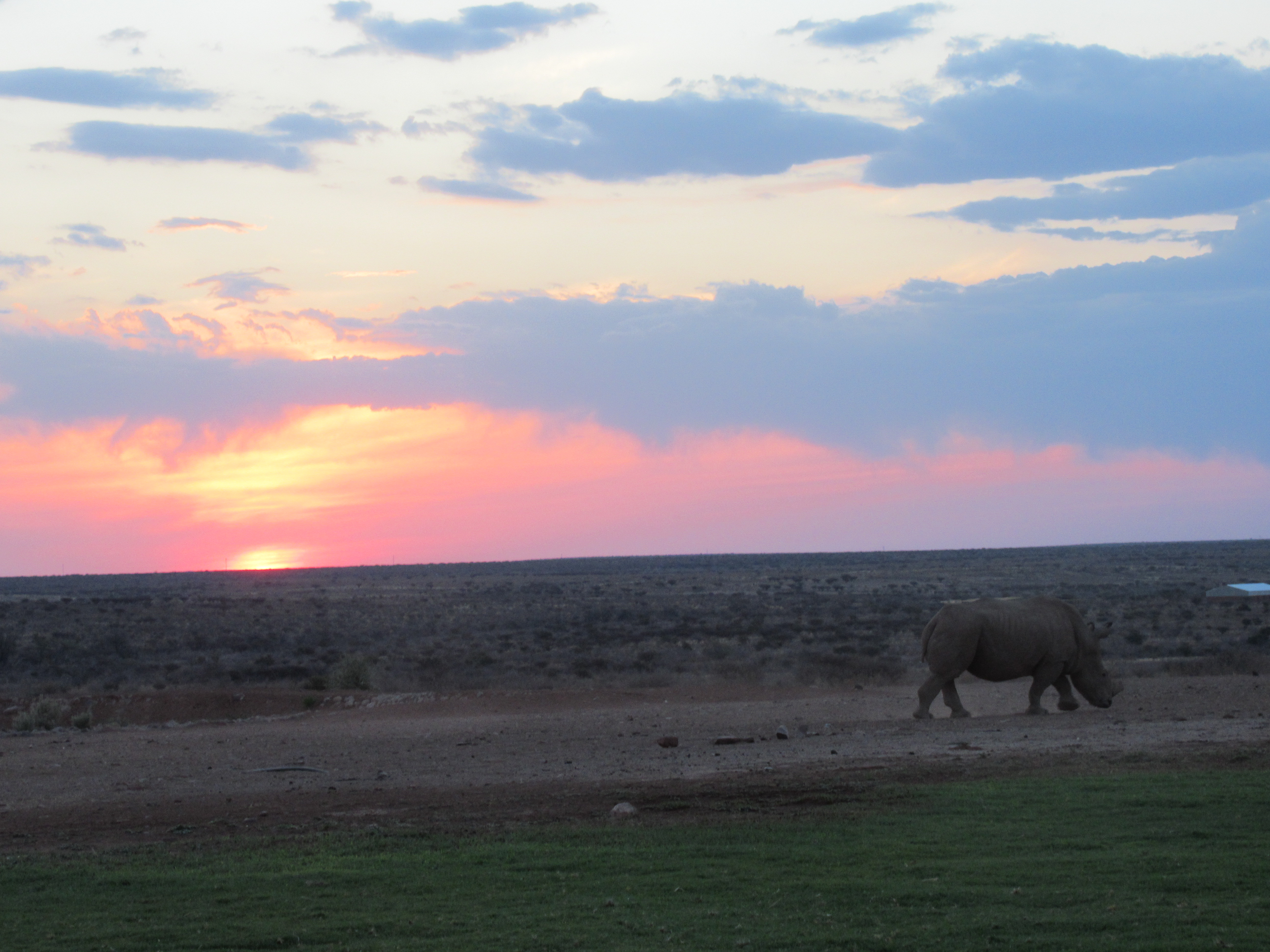 Um 18 Uhr traten wir vor die Tür um mit den anderen Gästen den Sundowner zu genießen. Nach einem Meter blieben wir allerdings abrupt stehen (Event) und überlegten wir wir an dem riesigen Nashorn, keine 10 Meter vor uns, vorbeikommen könnten. Da das Tier sich ausschliesslich um die saftigen Grashalme zu kümmern schien, schlichen wir quasi unbemerkt an dem Tier vorbei zum Abendessen. Das Rätsel um die angelegte Rasenfläche war geklärt und im Laufe des Abends konnten wir neben dem Nashorn noch eine Vielzahl von Antilopen und die allgegenwärtigen Warzenschweine beobachten.