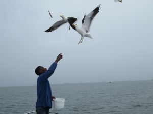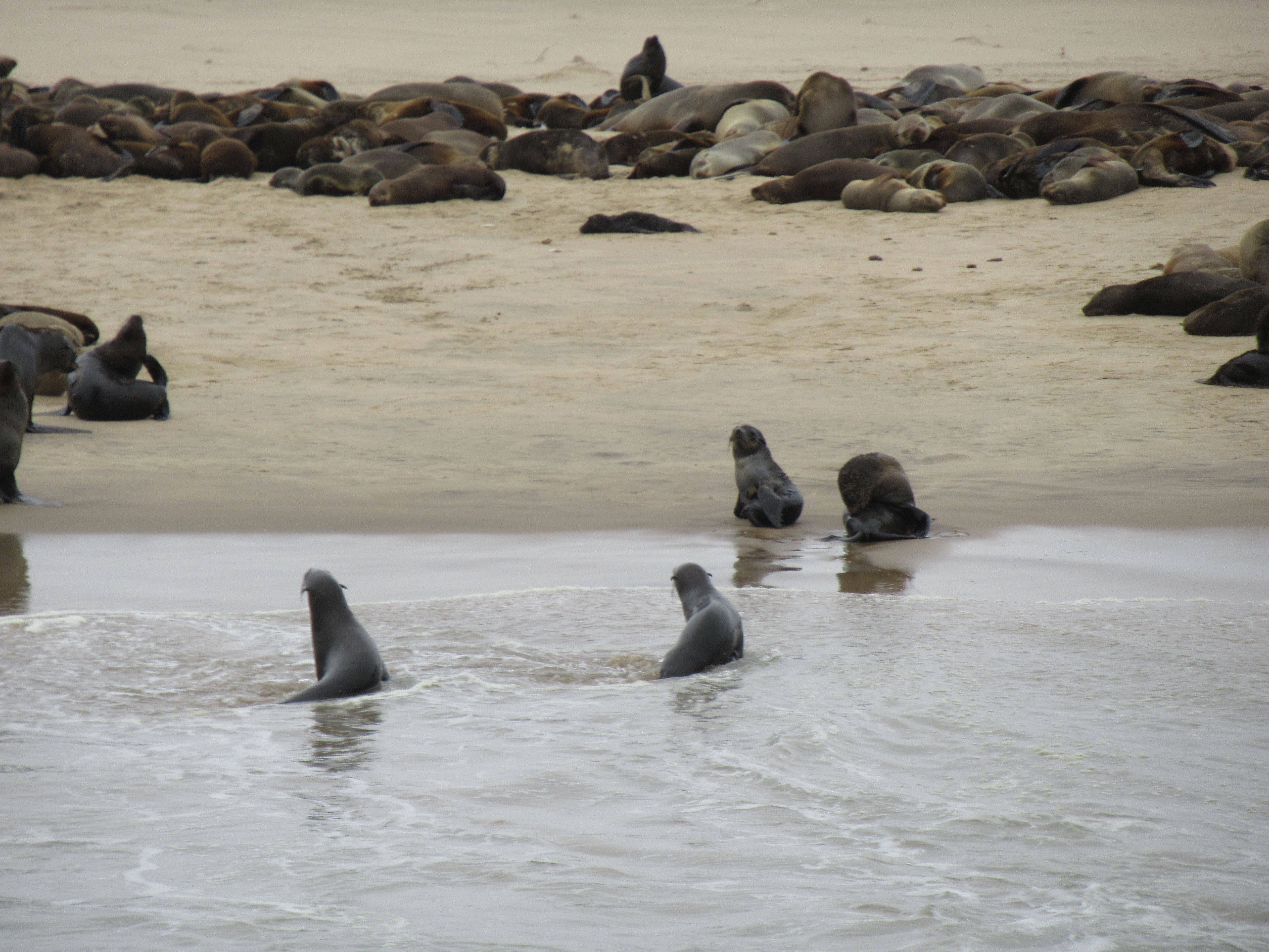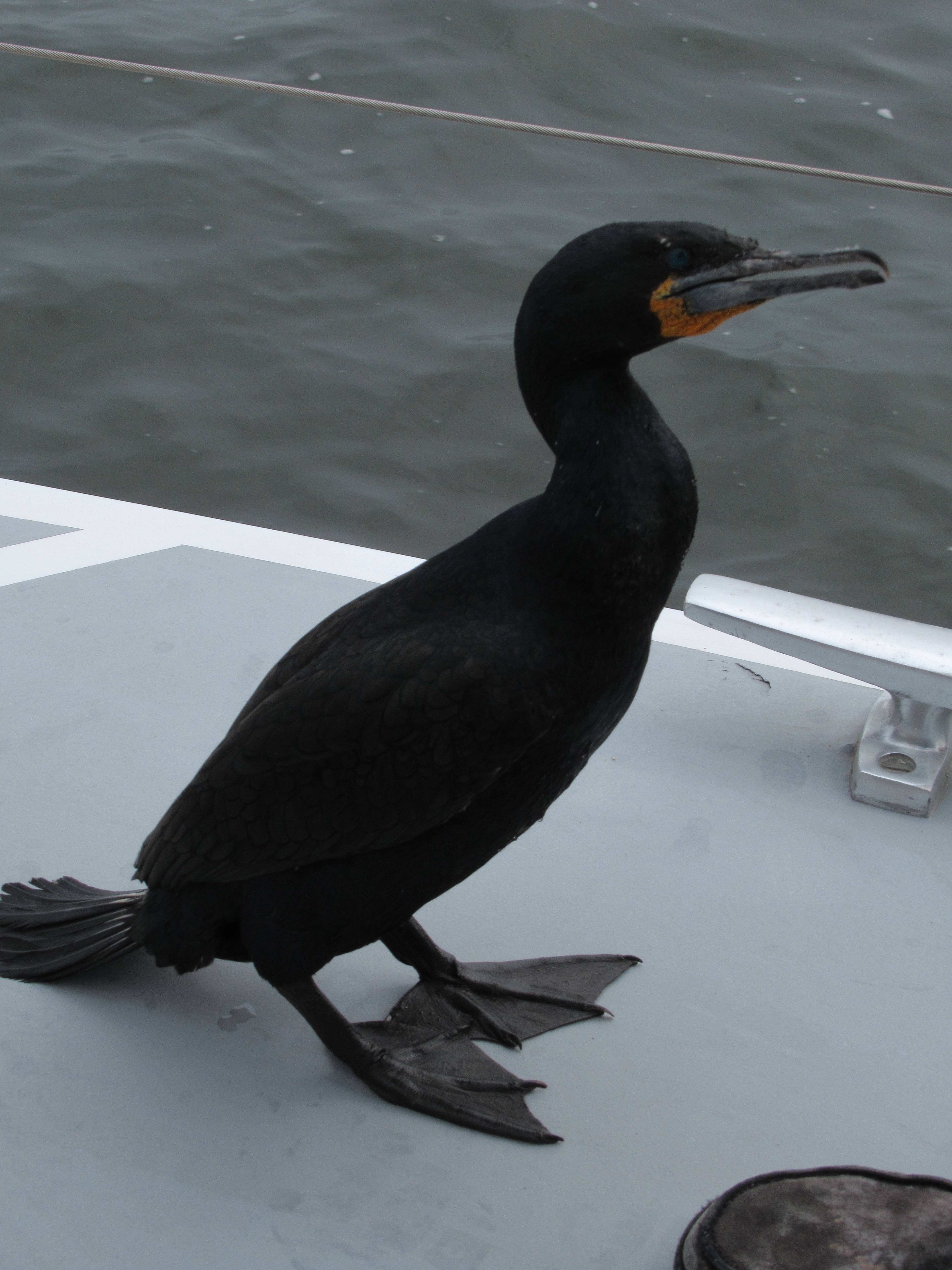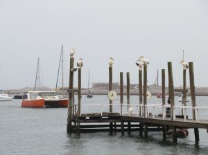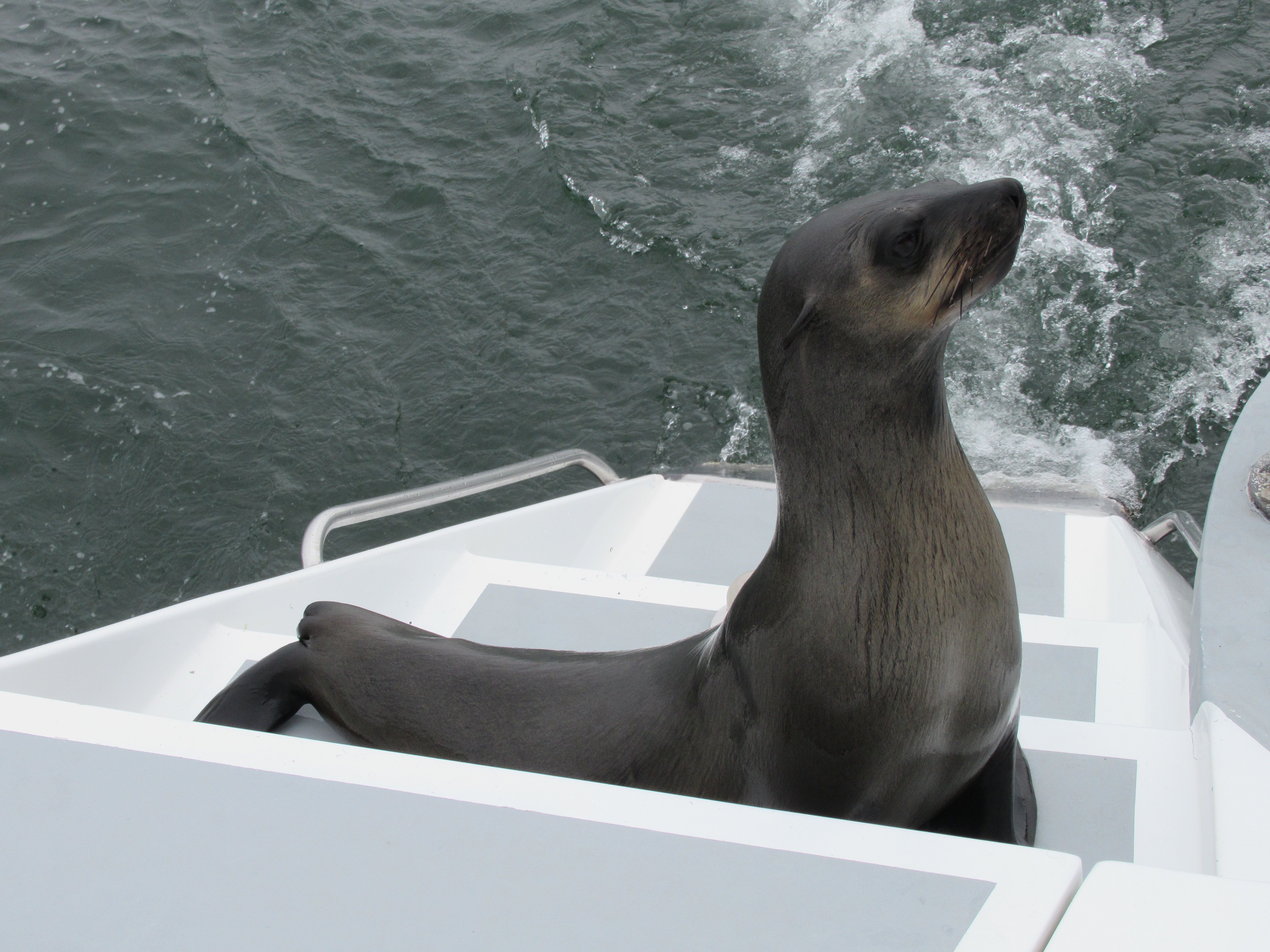 Auf der Katamaran Tour wurden wir von mehreren Pelikanen begleitet, die allerlei Kunststücke im Flug darboten und die Passagiere mit zielgenauen Landungen über die Köpfe hinweg beeindruckten. Wir bekamen Besuch von einem Kormoran und einer vorwitzigen Robbe, die bei voller Fahrt auf die Treppe aufsprang.