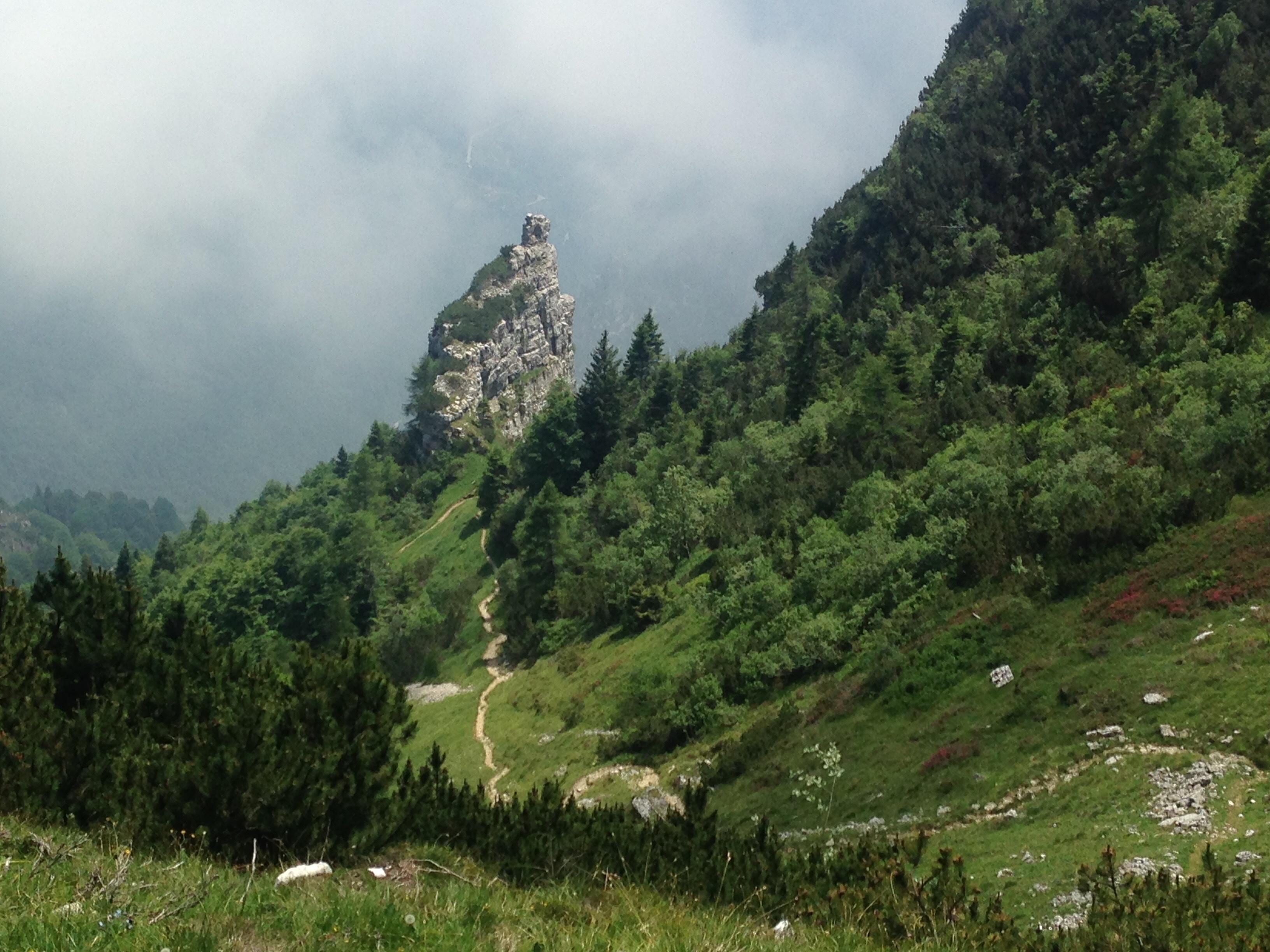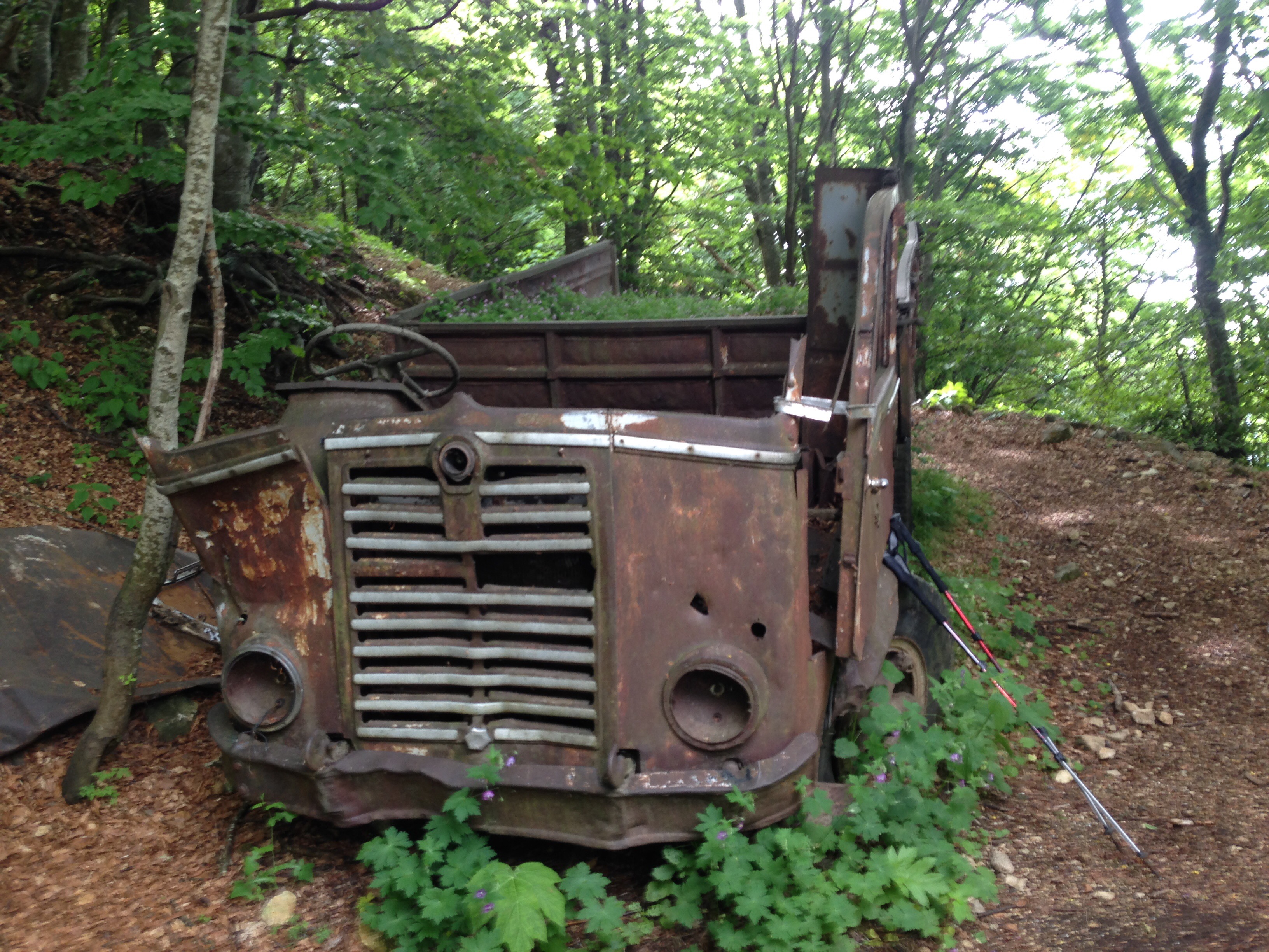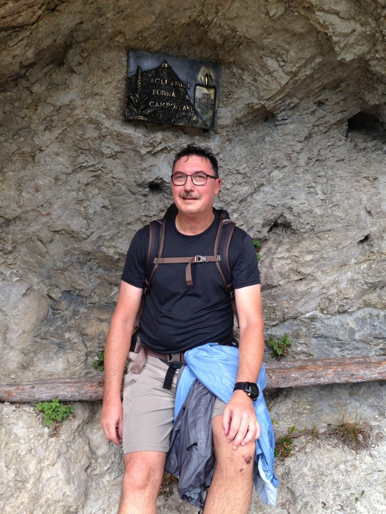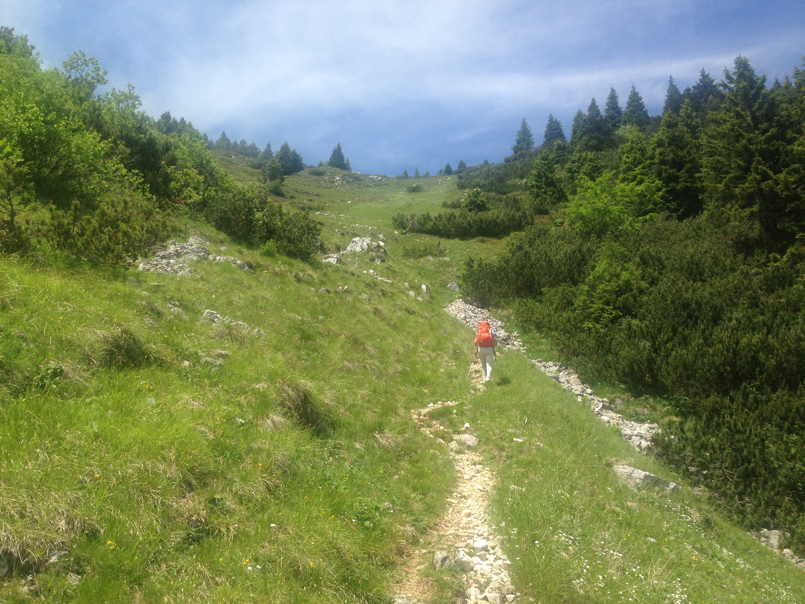 Wir begannen mit dem ersten Aufstieg einen Fahrweg entlang, der sich rund 600 HM durch dichten Wald nach oben schlängelte. Unser Begleiter eilte voraus, verschwand immer wieder im Wald und fand wieder zu uns zurück. Wir dachten das er aufgrund seines Halsbandes jemandem im Dorf gehört und irgendwann wieder den Rückweg antritt. Weit gefehlt, er wich uns den ganzen langen und anstrengenden Weg über 28 Km lang nicht von unserer Seite. Auf jeden Fall wurde es lustig und kurzweilig mit dem Vierbeiner zwischen unseren Wanderstöcken. In der Mitte des schweißtreibenden Aufstiegs wälzte Randagio sich ausgiebig in Exkrementen anderen Waldbewohnern und beglückte uns je nach Windrichtigung mit sehr unangenehmen Gerüchen. Dies hielt sich über Stunden, kein Wunder, denn es tropfte Randagio sinnbildlich aus den Ohren.