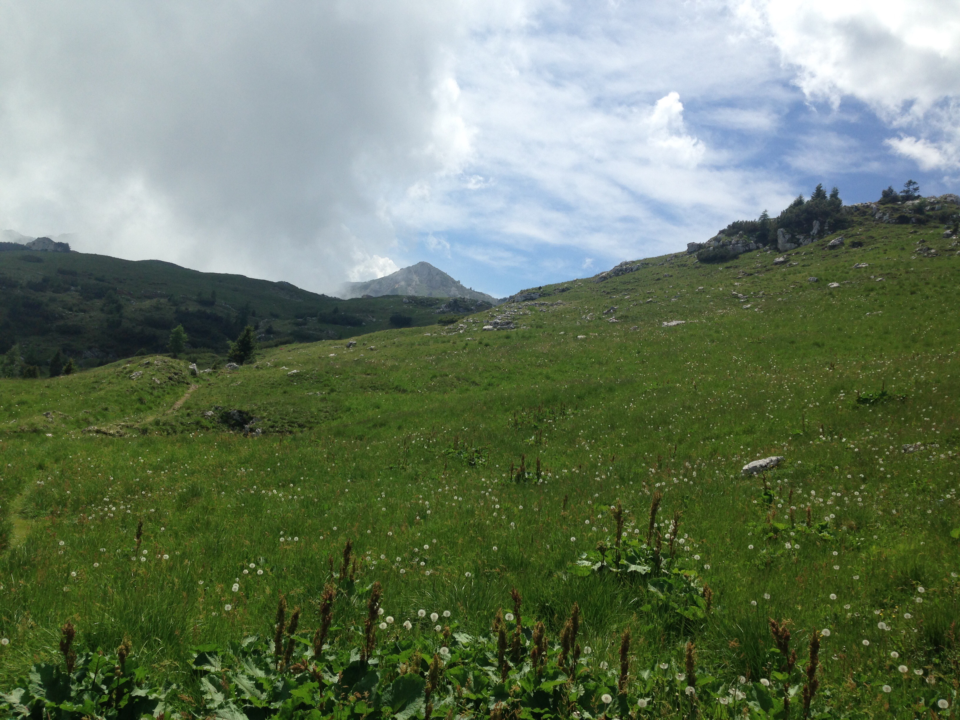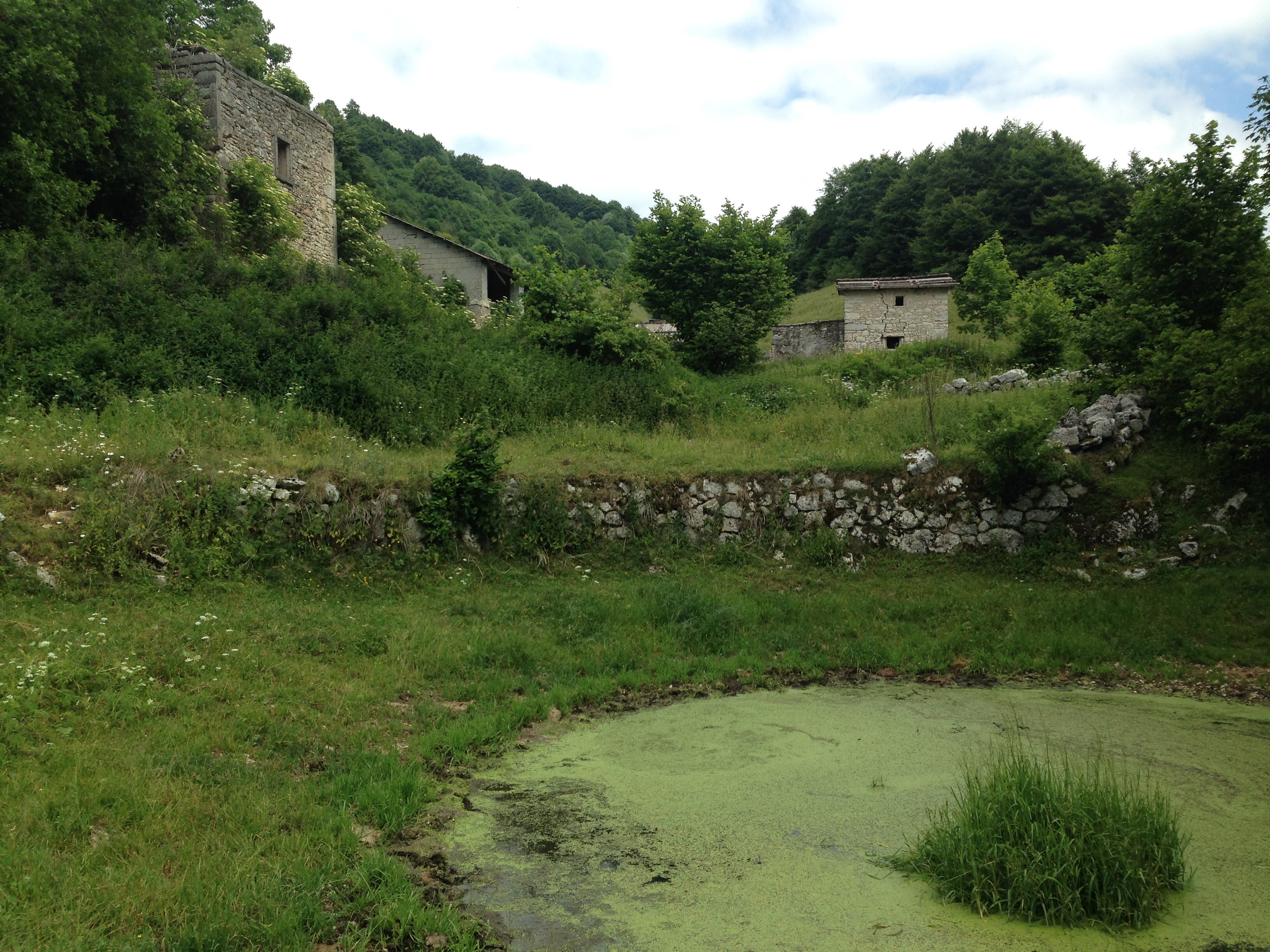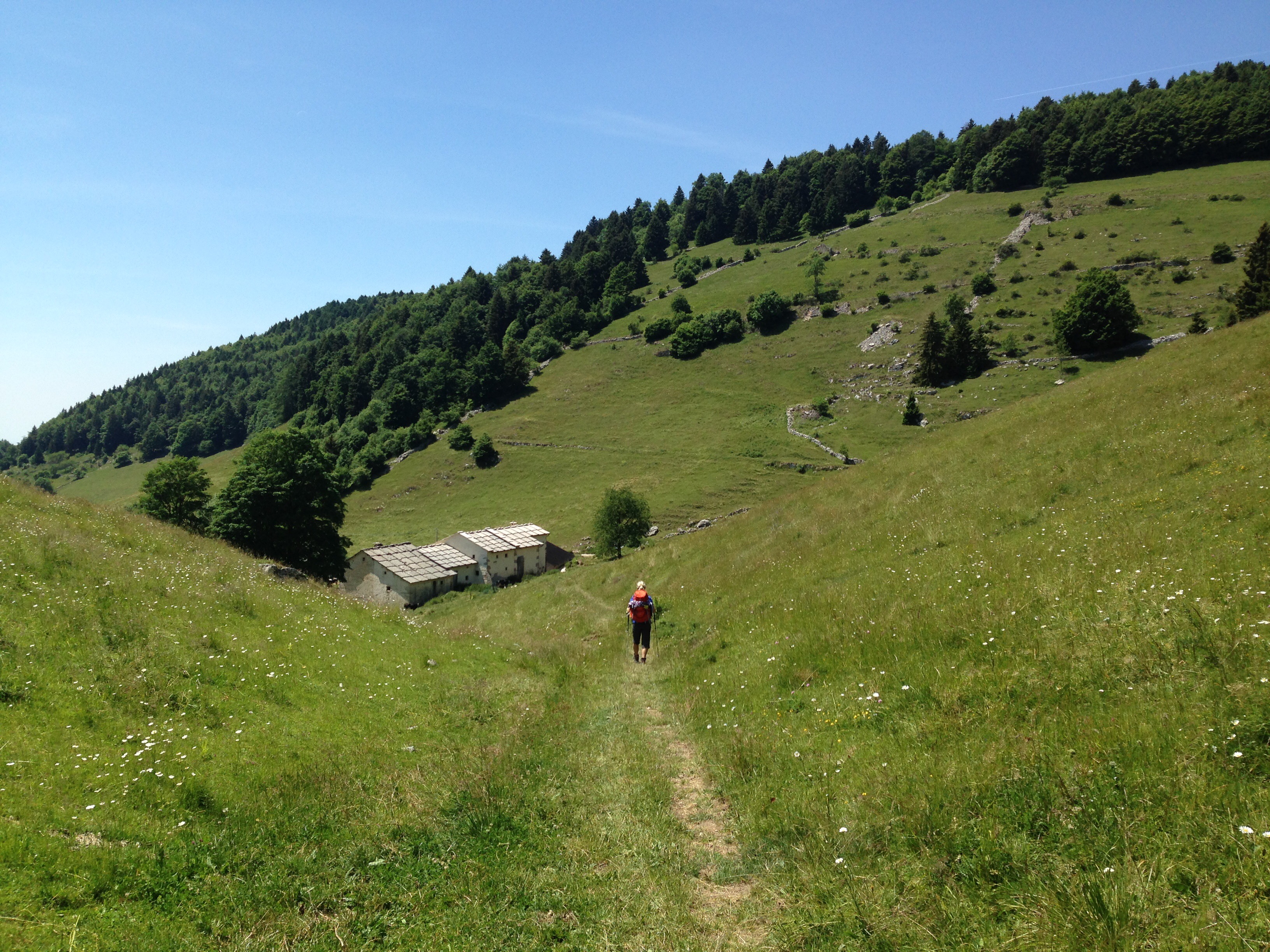 Auf einer Hochebene angekommen pausierten wir auf einer Wiese und hatten alle Hände voll zu tun Randagio geruchsbedingt auf Abstand zu halten. Der Weg wurde offener, führte zu einer Teerstraße und an Bauerhöfen vorbei. Wir kreuzten eine Landstraße und fanden die Wegweiser nicht. Wir orientierten uns an der Beschreibung des Wanderführers und der Himmelsrichtung und folgtem einem Pfad nach unten. Zumindest stellte sich dies nicht als den Normalweg heraus, führte er uns später durch Stacheldraht gesicherte Kuhweiden. Wir kletterten mal drüber oder krochen unten hindurch und beobachten wie Randagio jede Kuh aufscheuchte und anbellte. Dies führte jedes Mal zu Hektik unter den Kühen und gelegentlichen Gegenangriffen und wir befanden uns mitten im Spektakel. Zureden half auf jeden Fall nichts und wir waren froh ohne Konfrontation mit den aufgeschreckten Kühen davon gekommen zu sein.
