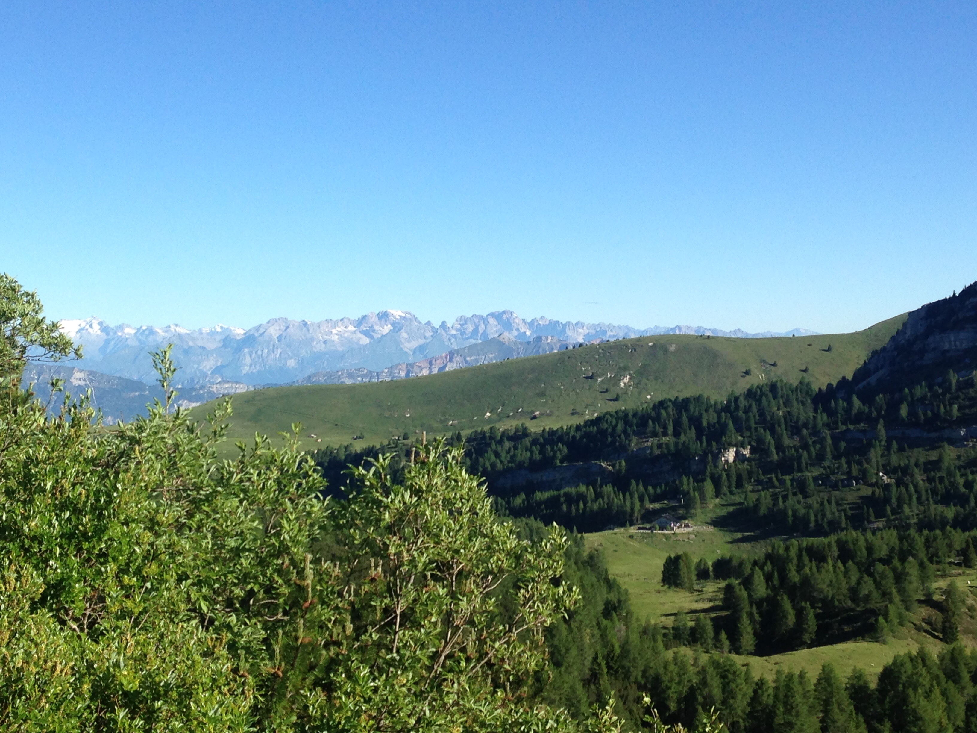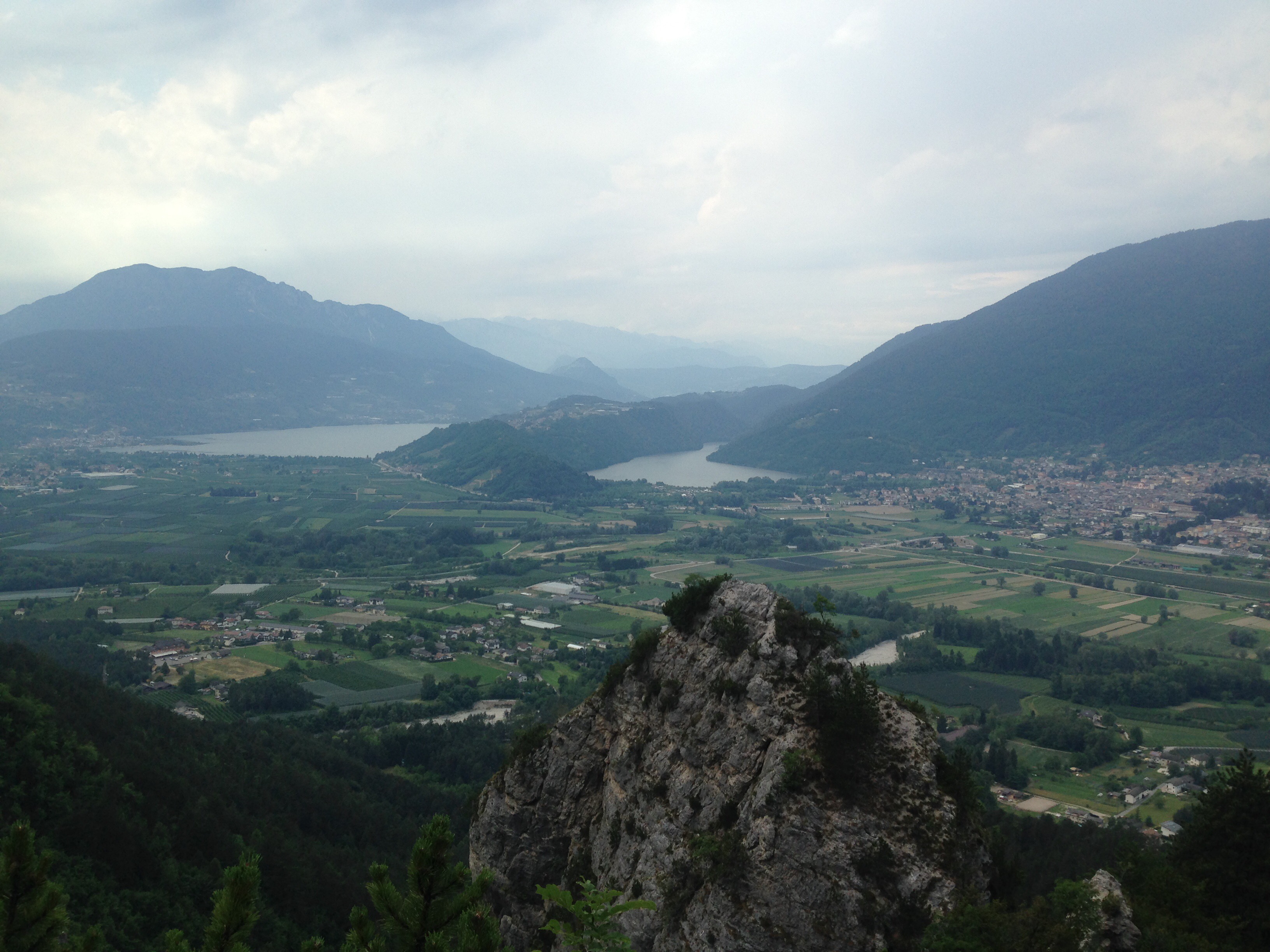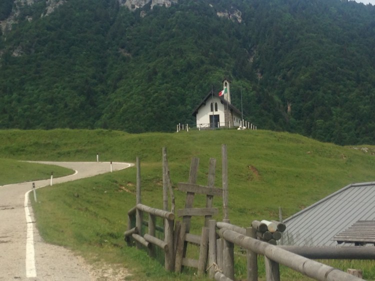 Auf einer Hochebene angekommen pausierten wir auf einer Wiese und hatten alle Hände voll zu tun Randagio geruchsbedingt auf Abstand zu halten. Der Weg wurde offener, führte zu einer Teerstraße und an Bauerhöfen vorbei. Wir kreuzten eine Landstraße und fanden die Wegweiser nicht. Wir orientierten uns an der Beschreibung des Wanderführers und der Himmelsrichtung und folgtem einem Pfad nach unten. Zumindest stellte sich dies nicht als den Normalweg heraus, führte er uns später durch Stacheldraht gesicherte Kuhweiden. Wir kletterten mal drüber oder krochen unten hindurch und beobachten wie Randagio jede Kuh aufscheuchte und anbellte. Dies führte jedes Mal zu Hektik unter den Kühen und gelegentlichen Gegenangriffen und wir befanden uns mitten im Spektakel. Zureden half auf jeden Fall nichts und wir waren froh ohne Konfrontation mit den aufgeschreckten Kühen davon gekommen zu sein.