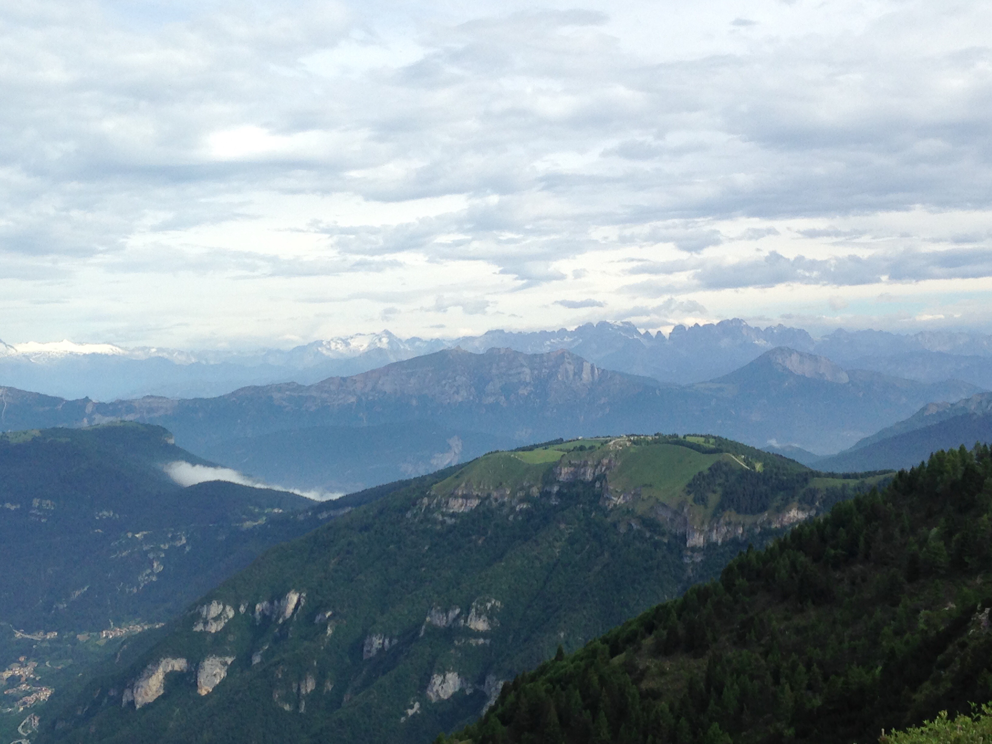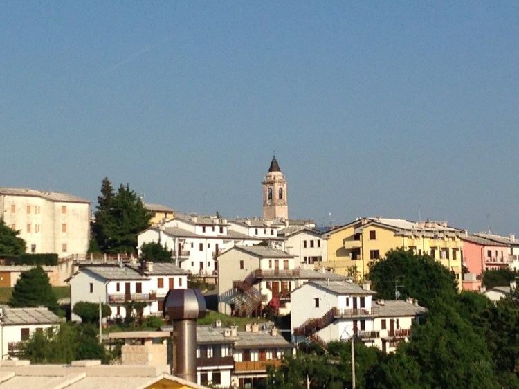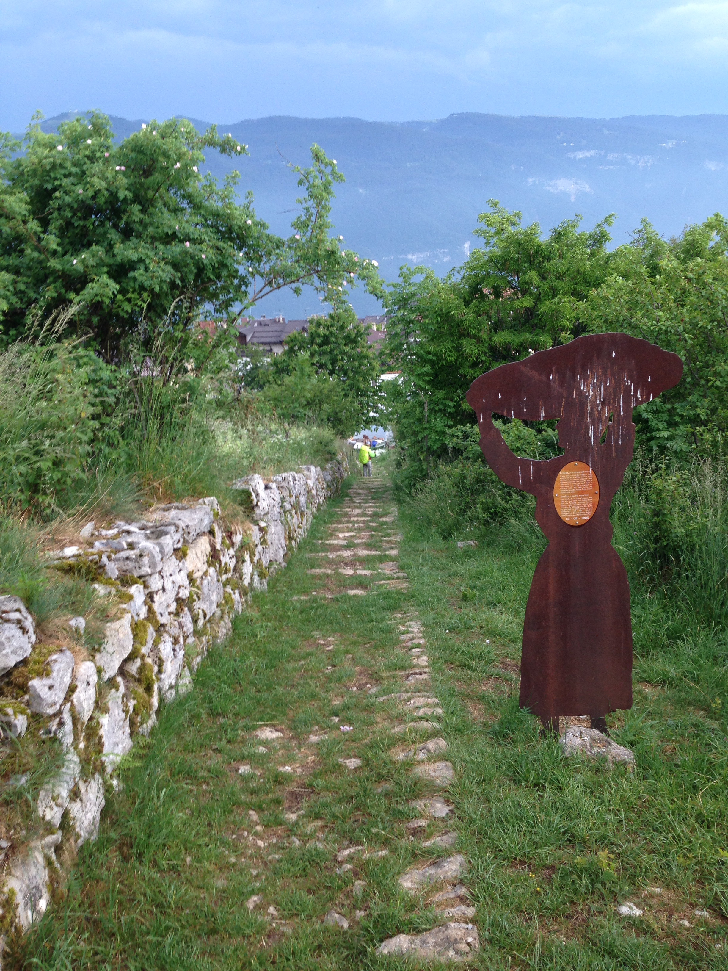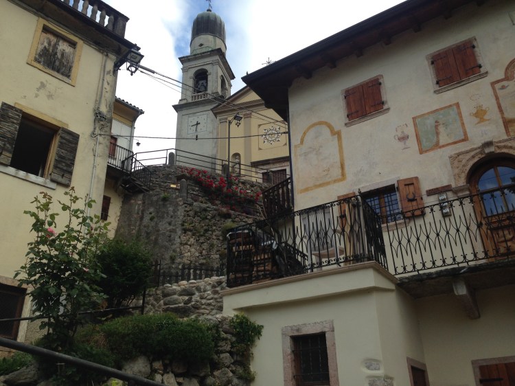 Über Stunden zog sich der Weg durch eine hügelige, aber abwechslungsvolle Landschaft. Ab und an kamen wir an einem Bauernhof vorbei, sahen aber keine Menschen. Alles schien wie ausgestorben und verlassen. Abwechslung brachte die Jagd auf Kühe durch einen den Streuner (Italienisch Randagio), der immer noch sichtlich Spaß verspürte, sich aber immer öfter eine Pause im Schatten könnte. Inzwischen war es später Nachmittag und das anstrengendste Teilstück stand uns noch bevor. Die Wasservorräte waren am Ende, es wurde stickig heiß in einem beinahe suptobisch anmutenden Waldgebiet. Wie auf einem Dschungelpfad schlängelte sich der Weg durch dichtes Wald- und Blattwerk und wir mußten aufpassen den Wegweiser zum Aufstieg nach Erbezzo nicht zu verpassen. Der Aufstieg war ein extrem steiler schmaler Serpentinenweg der laut Wanderführer in 35 Minuten zu bewältigen sei. Wir benötigen über eine Stunde mit etlichen kleinen Ruhepausen um den Puls wieder nach unten zu bekommen. Am Ende unserer Kräfte erreichten wir den pittoresken Dorfplatz in Erbezzo und setzten uns auf eine Bank direkt am kleinen Supermarkt. Die Anstrengung verlangte gierig nach einer eiskalten Cola und einem Snickers. Unser Begleiter macht inzwischen das halbe Dorf unsicher, stürmt in den Supermarkt, ins Lager, ins Immobilienbüro gegenüber und auch in die Küche des Albergo Berna, indem wir eigentlich übernachten wollten. Das Albergo war angeblich voll mit Filmleuten besetzt und der Besitzer organisierte uns ein Zimmer in einem B&B. Die Besitzerin des Supermarktes wiederum nahm sich dann unseres Strolches an, nachdem wir glaubhaft versichern konnten, dass das Tier nicht zu uns gehörte. Ein Dorfpolizist holte dann den Hund bei unserer endgültigen Unterkunft, dem B &B La Stua ab und wir hoffen das er wieder zu seinen Besitzern zurückgebracht wurde.