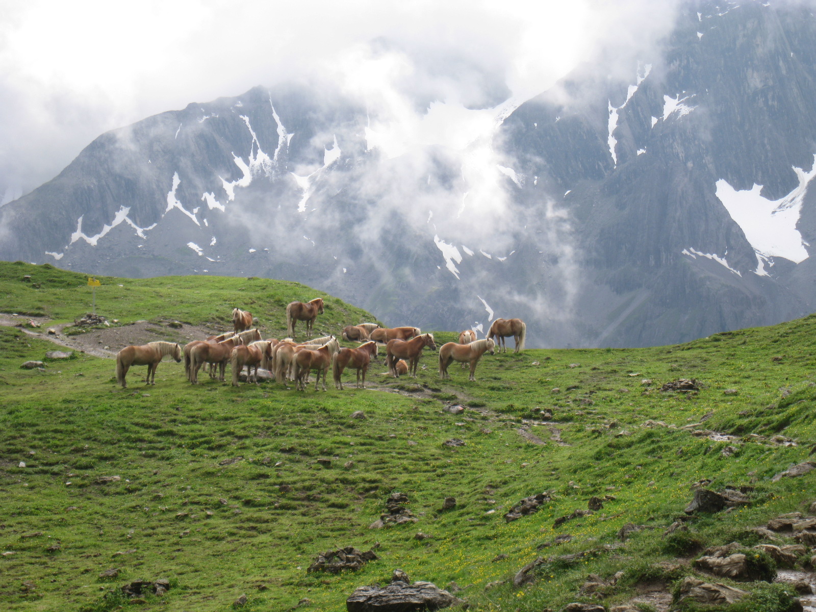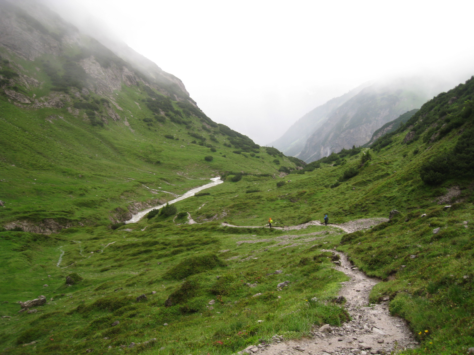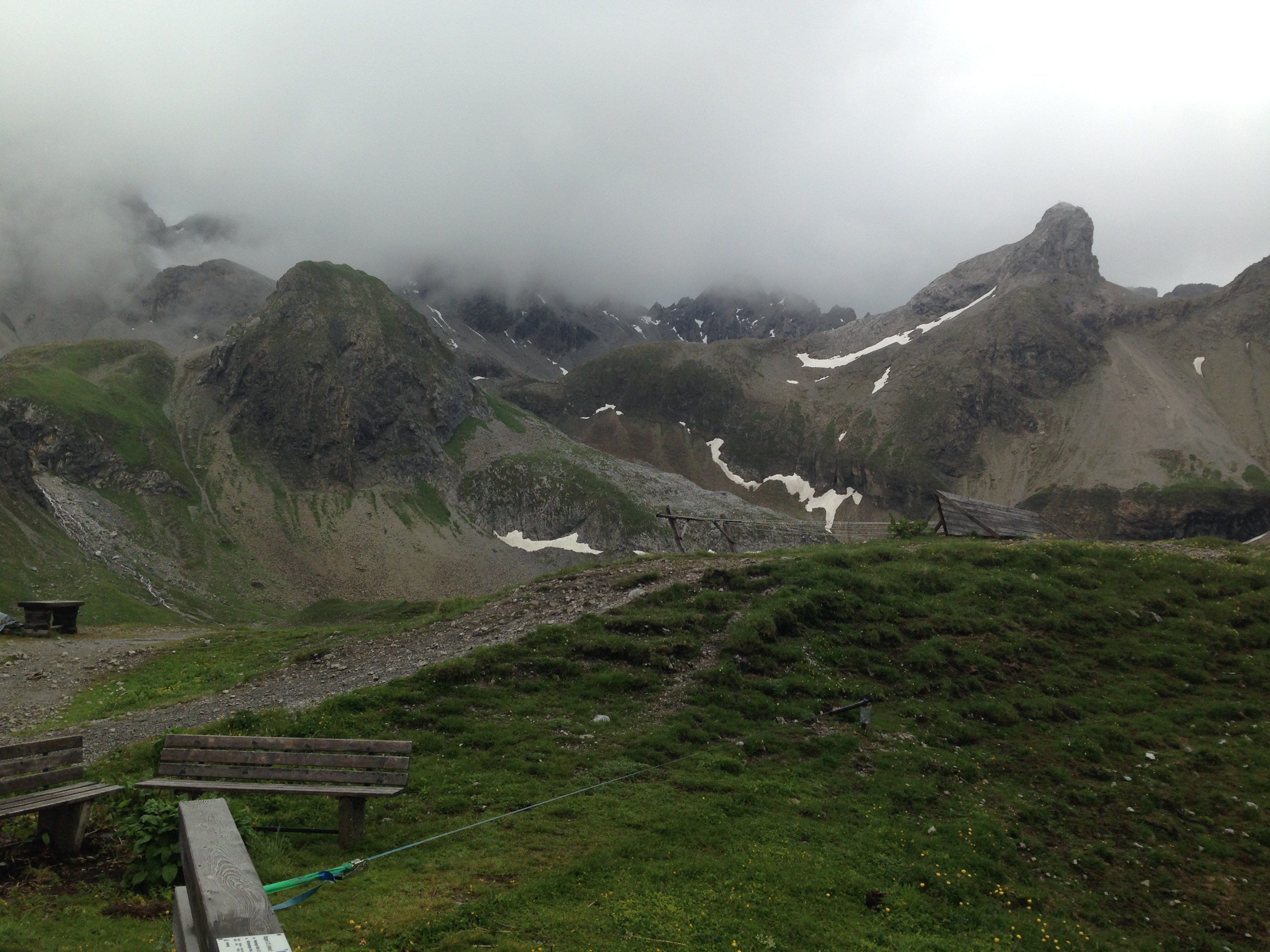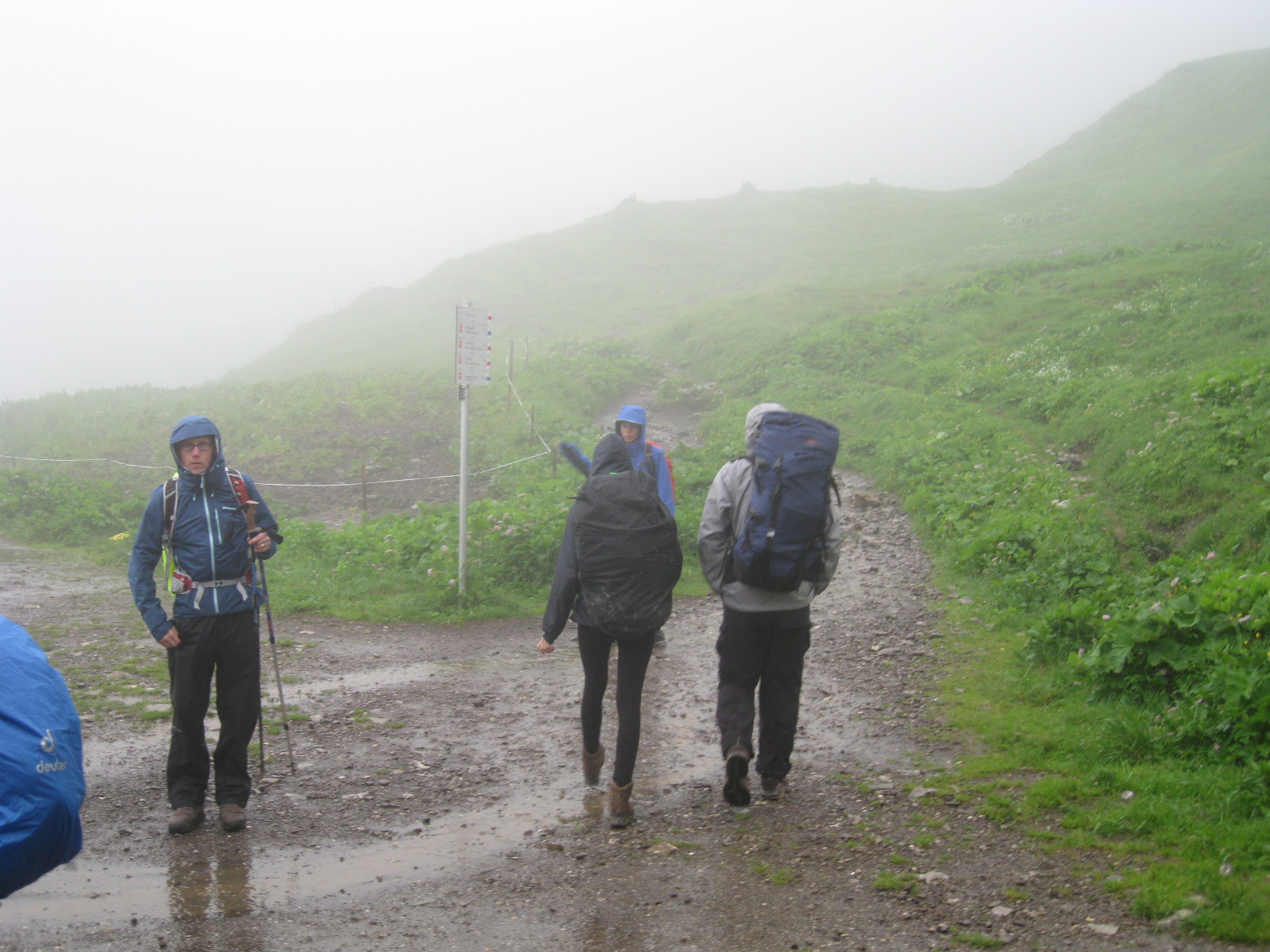 Die nassen Sachen in den Rucksack stecken bringt schliesslich auch nichts, denn dann sind am Ende des Tages alle Sachen nass. Schon beim Verlassen der Hütte schüttet es aus Eimern und wir machen uns trotzdem auf den kurzen Anstieg auf das Mädlejoch, das wir nach einer knappen 1/2 Stunde erreichen. Der Anstieg reicht aus, um ins Schwitzen zu kommen und die Kleidung wieder auf „Betriebstemperatur“ zu bringen.