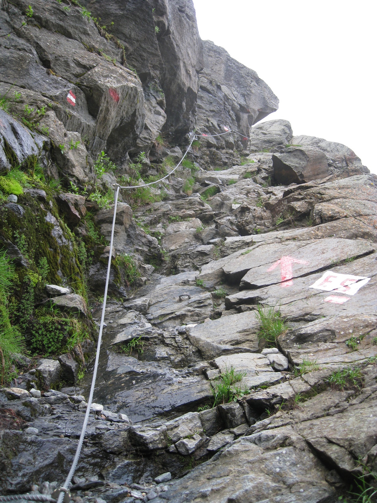 Danach führt der Weg zwischen Felsbrocken hindurch, steigt stetig an und überquert hin und wieder den Bachlauf. Immer dem Wasserfallweg folgend (macht seinem Namen alle Ehre) kommt es dann zum ersten steilen Aufstieg, der zum Teil mit Seilen versichert ist. Nach ca. 1,5 Stunden errreicht man wieder den Fahrweg und muß diesen ein Teilstück entlanglaufen.