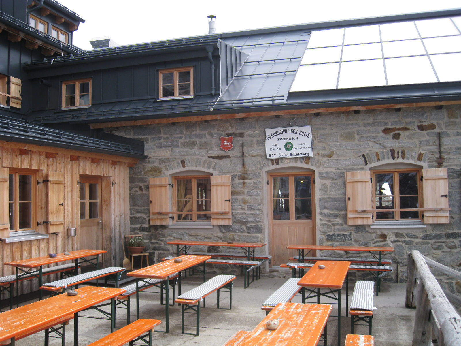 Nach weiteren 30 Minuten kräftezehrenden Aufstiegs erreiche ich gegen 11.30 Uhr die Braunschweiger Hütte bei Sonnenschein und tollem Rundumblick auf die hochalpine Landschaft.