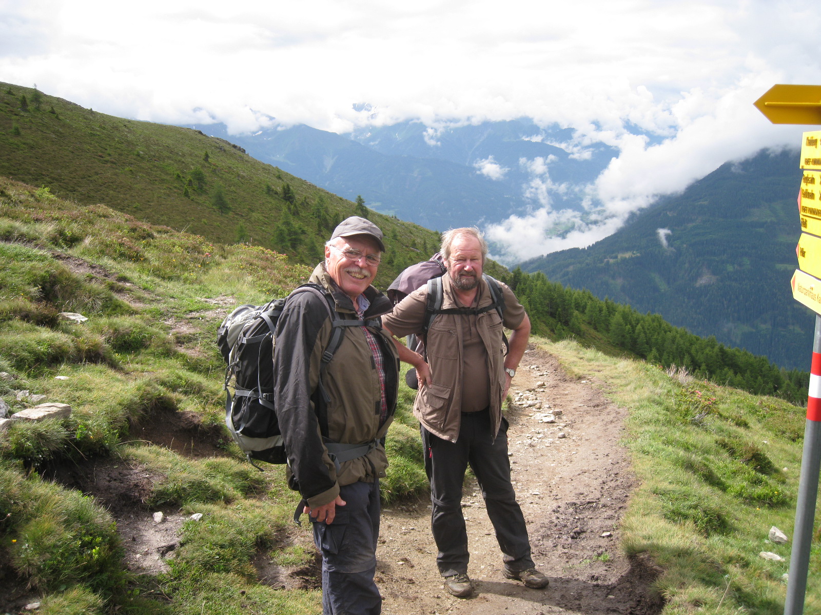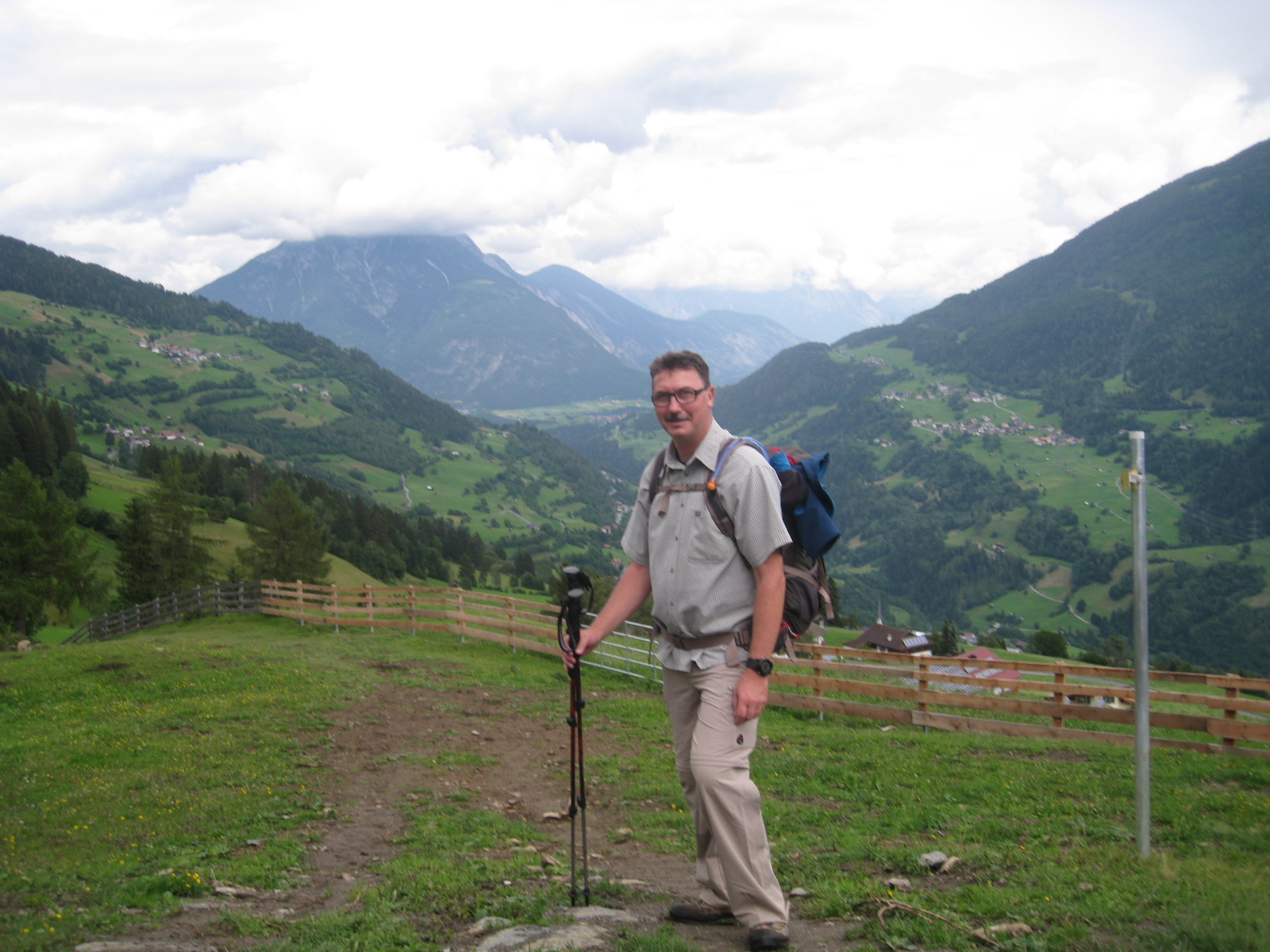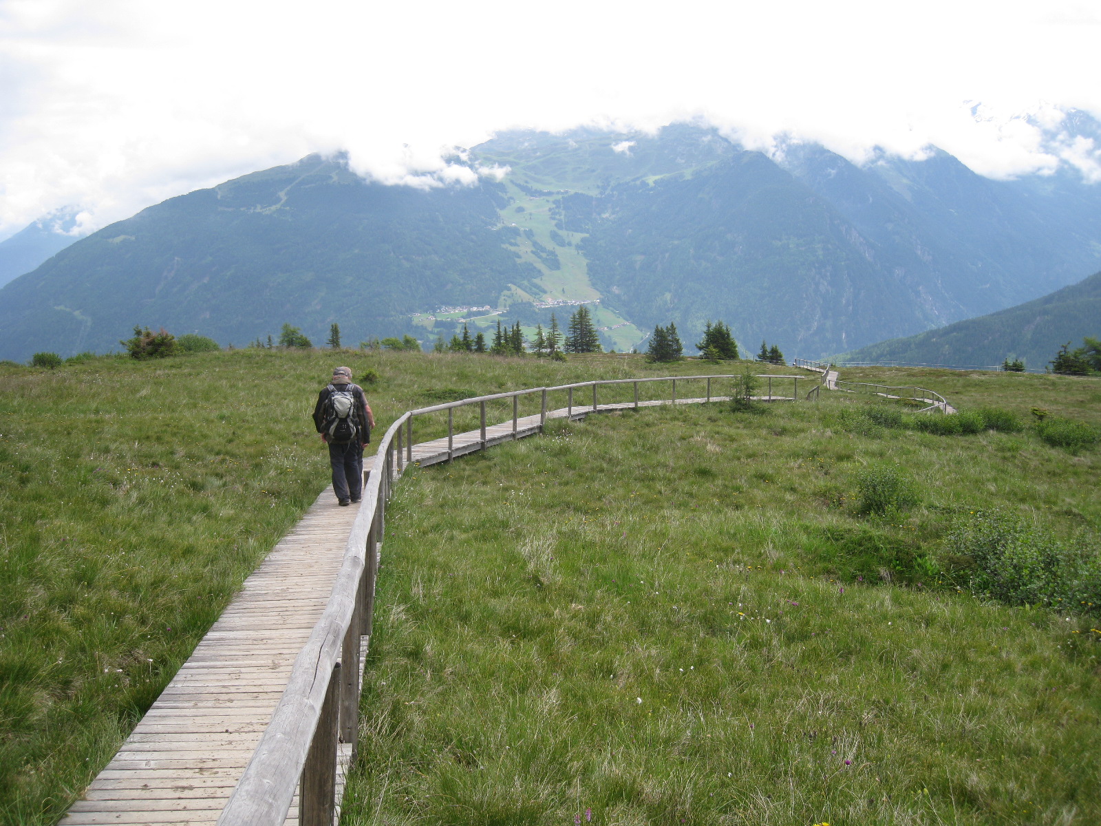 Weiter geht es auf morastigen Wegen und moorartiger Landschaft zur nächsten Hütte, auf der allerdings gerade die Prämierung von einem Melkwettbewerb läuft. Das ist uns zuviel Trubel und wir laufen weiter zur nächsten Alm, nur 30 Minuten entfernt und sehr schön gelegen. Dort legen wir eine ausführliche Rast ein. Ein deftiges Essen und diverse Weizenbiere später geht es beschwingt über Wiesen und Höfe hinunter nach Wenns. Dort verabschiede ich mich von Klaus und Hans, da wir uns aufgrund unterschiedlicher Ziele (Meran und Bozen) nicht wieder sehen werden. Um 14.30 Uhr komme ich im Alpina an und schaffe noch gemütlich zwei Saunagänge.