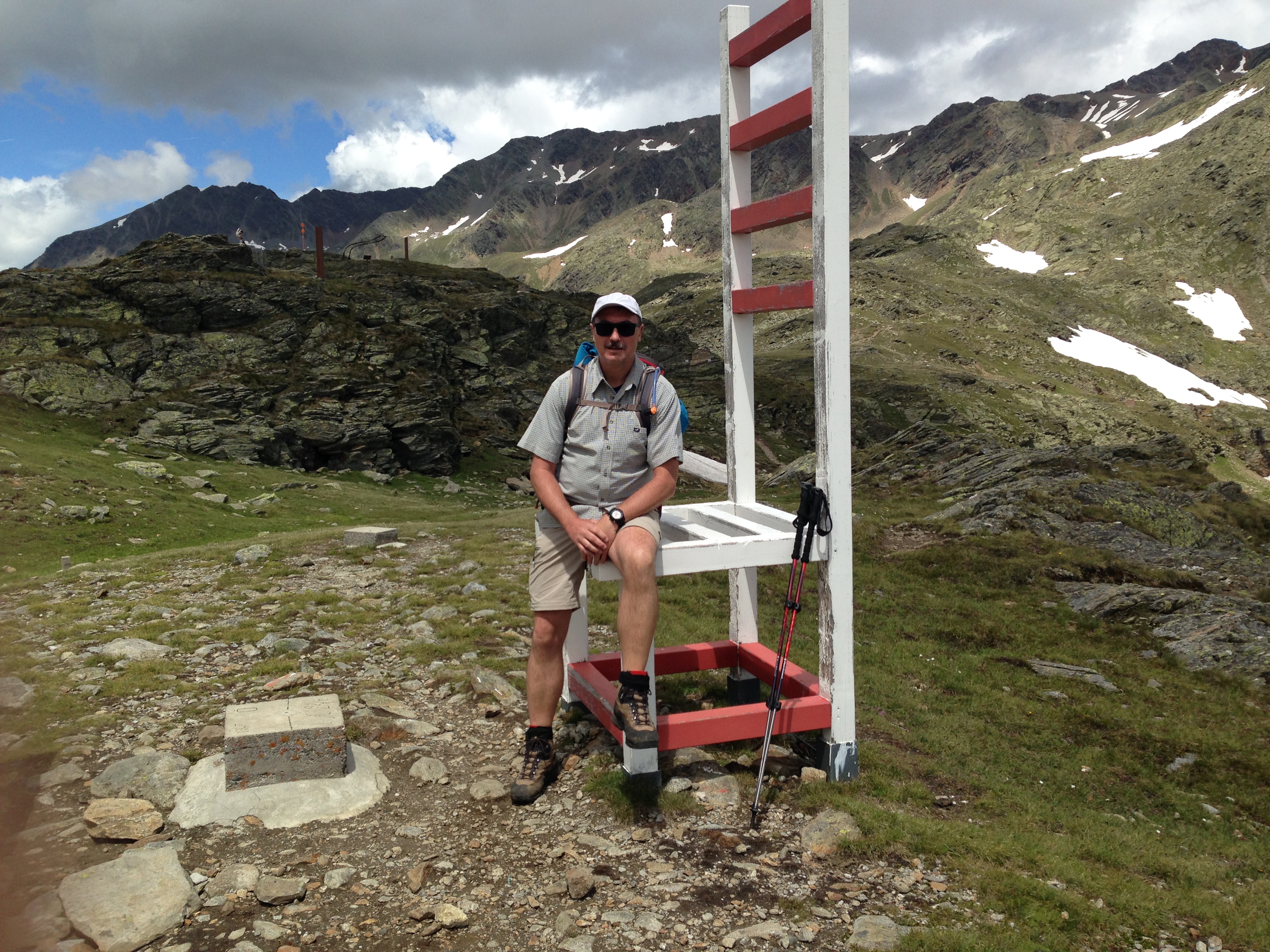 Kurz nach 11 Uhr erreiche ich die Timmelsjoch Hütte und treffe Anke und Harald wieder. Es werden die obligatorischen Fotos auf den zwei übergroßen Stühlen gemacht, einer steht auf der Seite in Österreich und der andere in Italien. Kurz dahinter beginnt der Abstieg und mein linkes Knie fängt an zu schmerzen. So werden die nächsten 2,5 Stunden zur Qual und jeder Schritt muss überlegt werden, um das Knie nicht zusätzlich zu belasten. An der Timmelsjoch Brücke angekommen liegt der steilste Teil des Abstiegs hinter mir und eine Pause in sehr schöner Umgebung ist mir sehr willkommen.