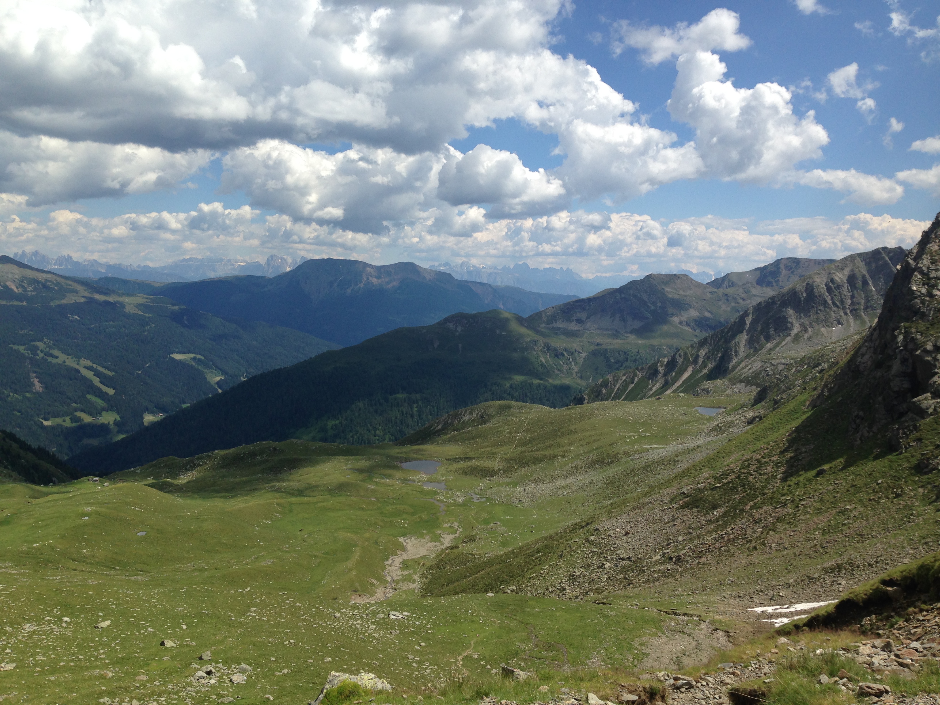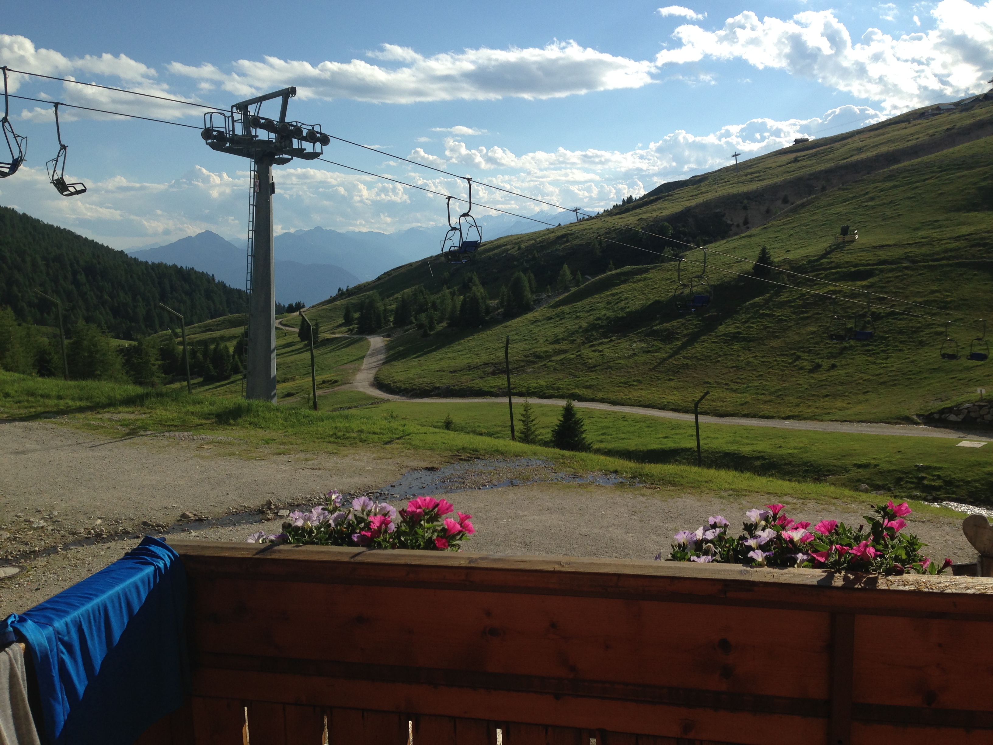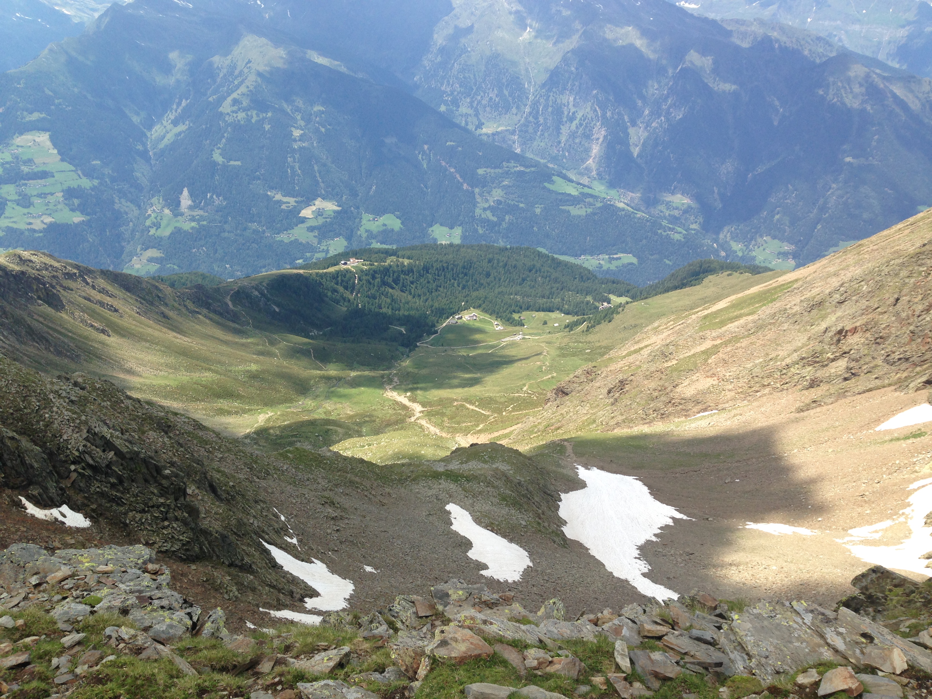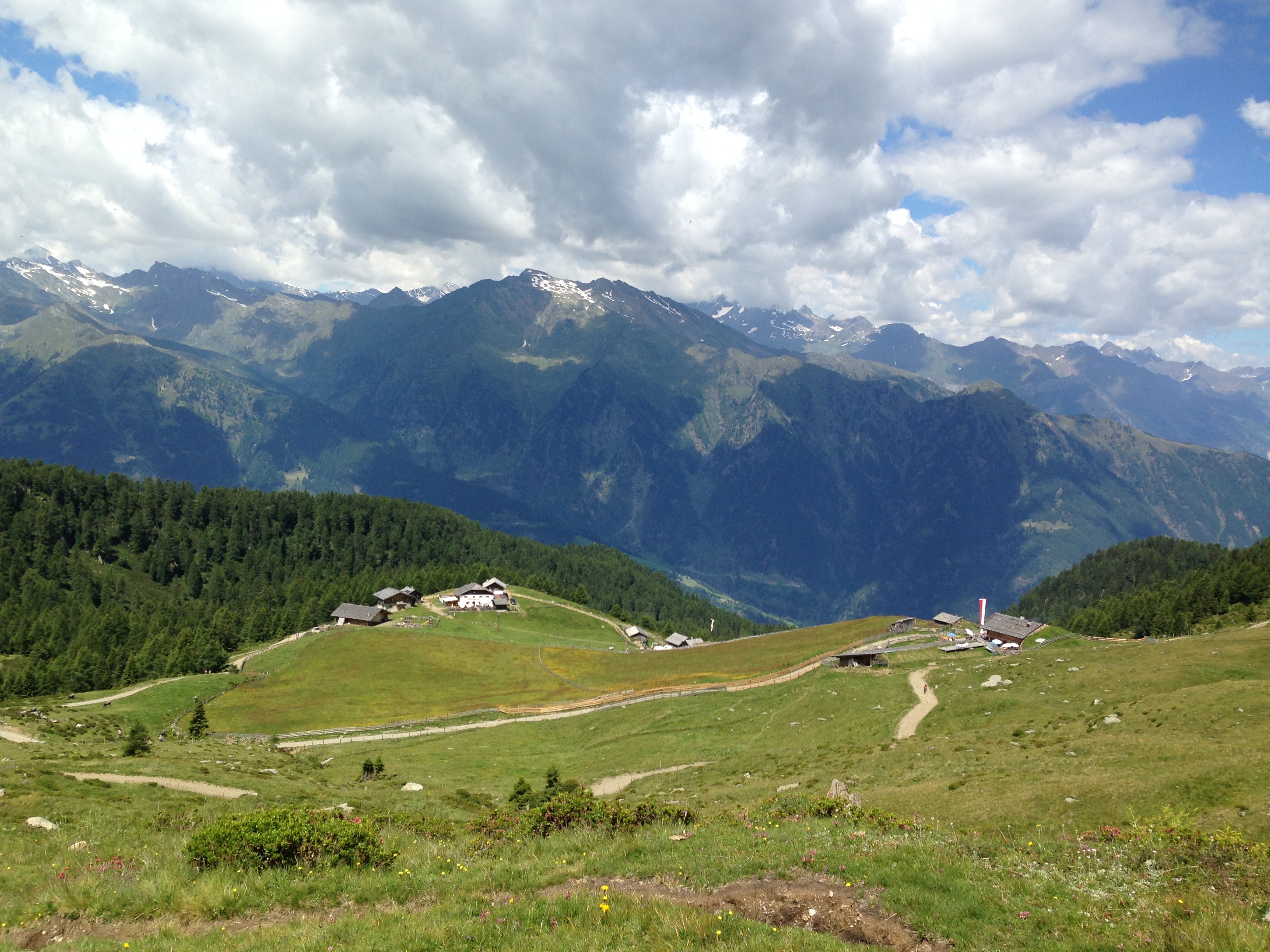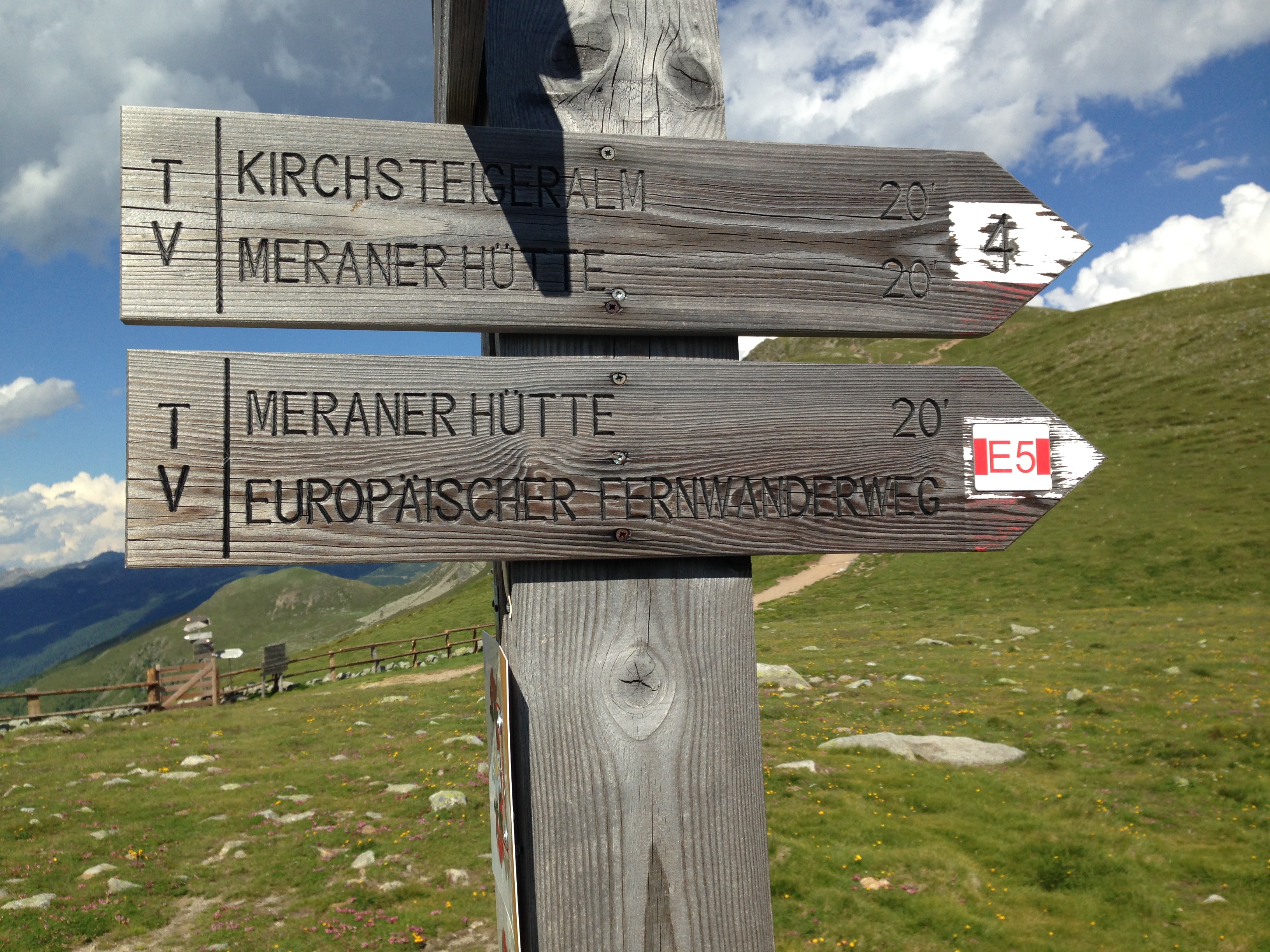 Bei optimalen Wetter und Sonnenschein geht es durch ein Waldgebiet stetig nach oben bis man in baumfreies Gebiet gelangt. Danach verläuft der E5 eine Bergflanke entlang, die bereits den Blick auf die Seilbahnstation des Hirzer eröffnet. Von Saltaus im Passeiertal fährt die Seilbahn in 10 Minuten auf den Gipfel und nach weiteren 15 Gehminuten erreichen die Tagestouristen die Hirzer Hütte. Von dort führen kurze Wanderwege zur Hintereggalm und zur Mahdalm. Gerade die Hintereggalm ist idyllisch hergerichtet und könnte die Kulisse für einen Südtiroler Bergfilm hergeben.