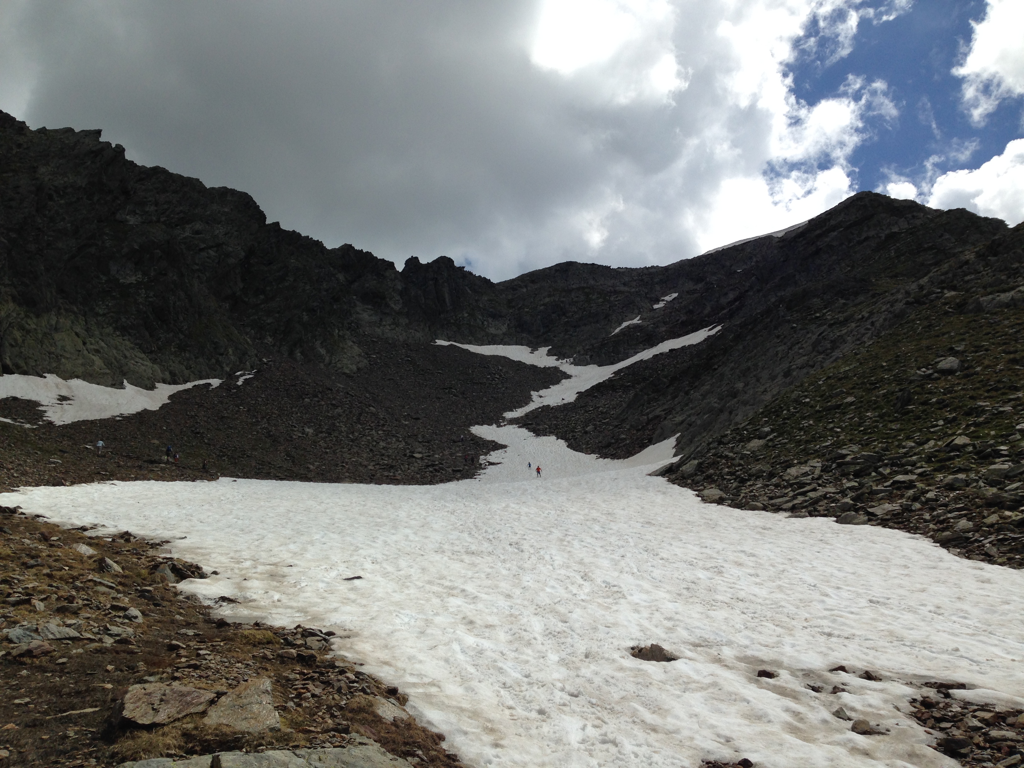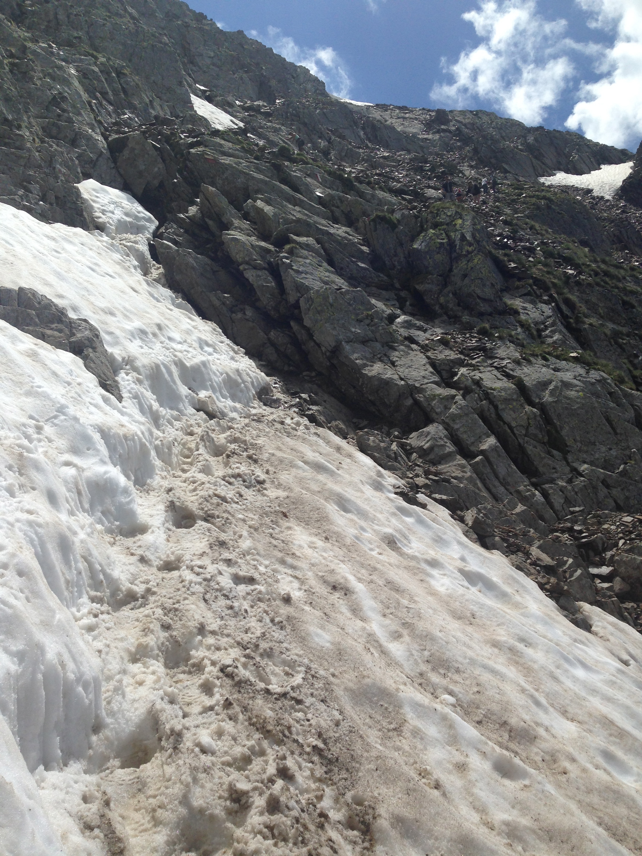 Danach geht es auf dem Jägersteig dem Gipfel entgegen, der den Namen Steig verdient hat und benötige anstrengende 2,5 Stunden, um zur Schlüsselstelle für den Aufstieg durch die obere Scharte auf 2.698m zu gelangen. Der Weg dahin führt über steile Geröllfelder die am Hirzer Kar auf 2.600m enden. Ich habe jetzt die Schlüsselstelle für den heutigen Tag erreicht. Laut Reiseführer handelt es sich um einen „schmalen und teilweise ausgesetzten Steig“ der rund 100m zur oberen Scharte führt. Kurz vorher ist ein schmales Schneefeld zu queren und ich lasse erst einmal zwei Tagestouristen durch, die mich schon auf dem Hinweg überholt hatten. Diese wünschten mir viel Glück und Spaß beim Aufstieg mit dem Hinweis, das Sie dies in Ihrem Leben nie wieder machen werden.