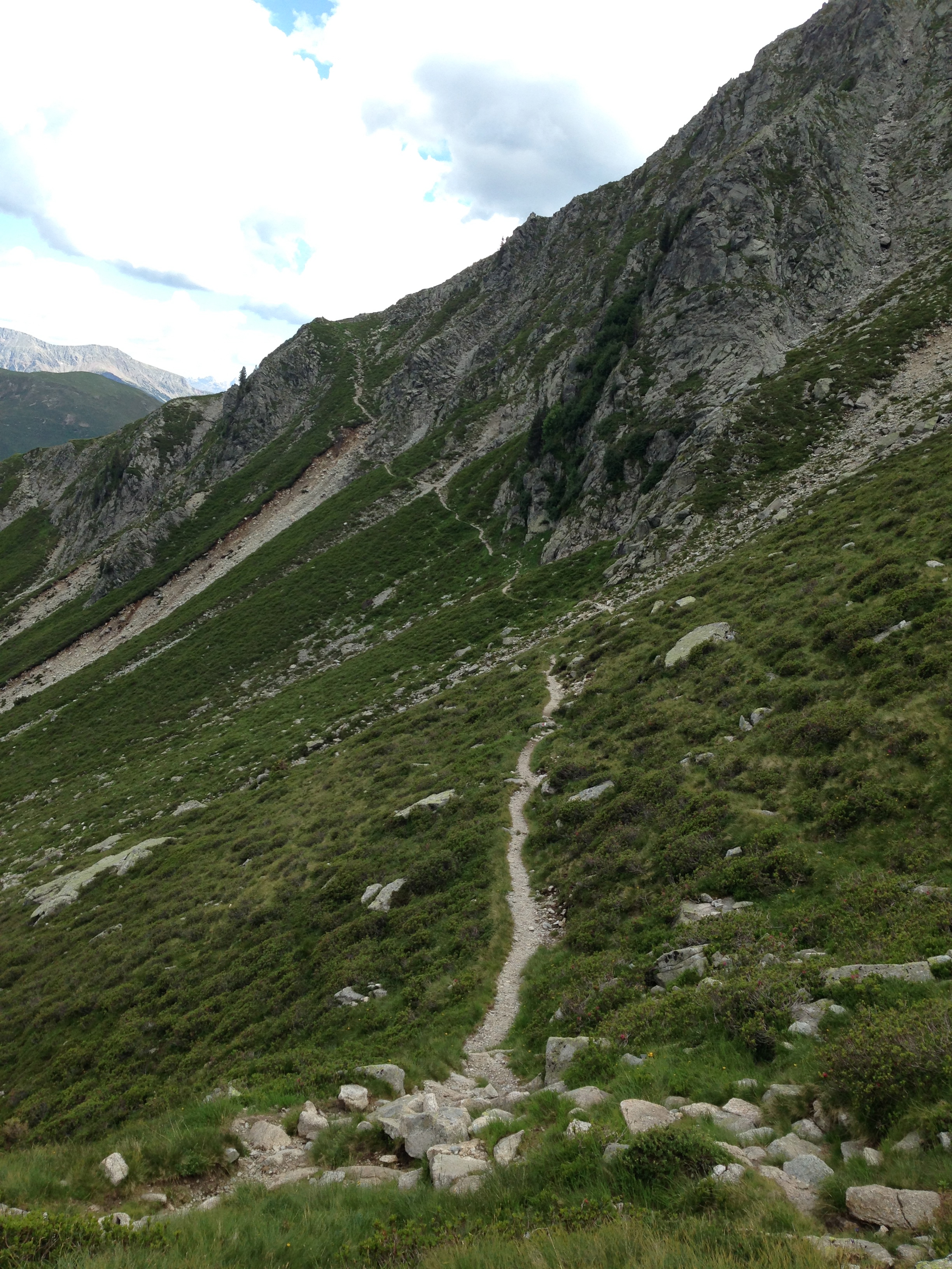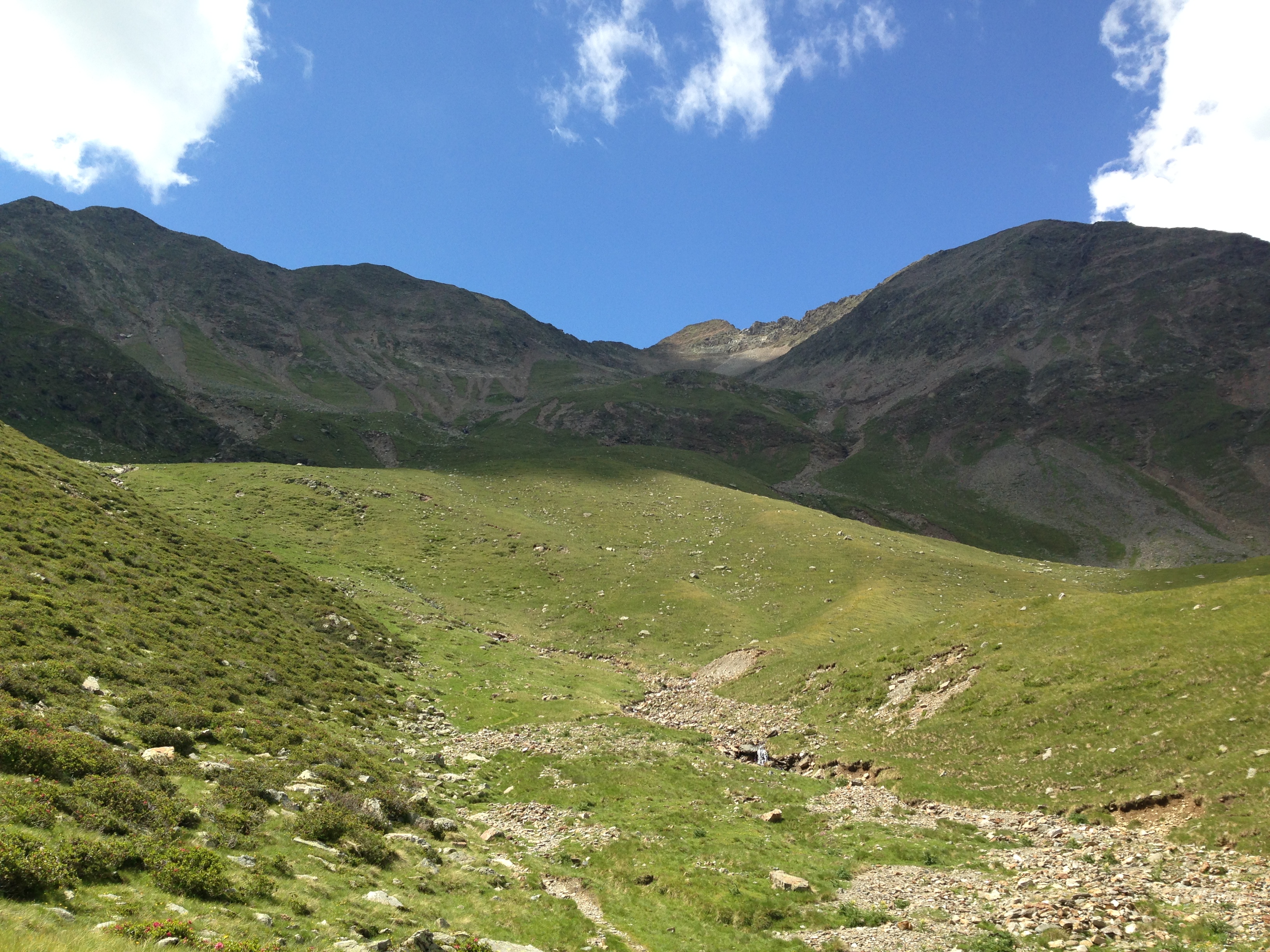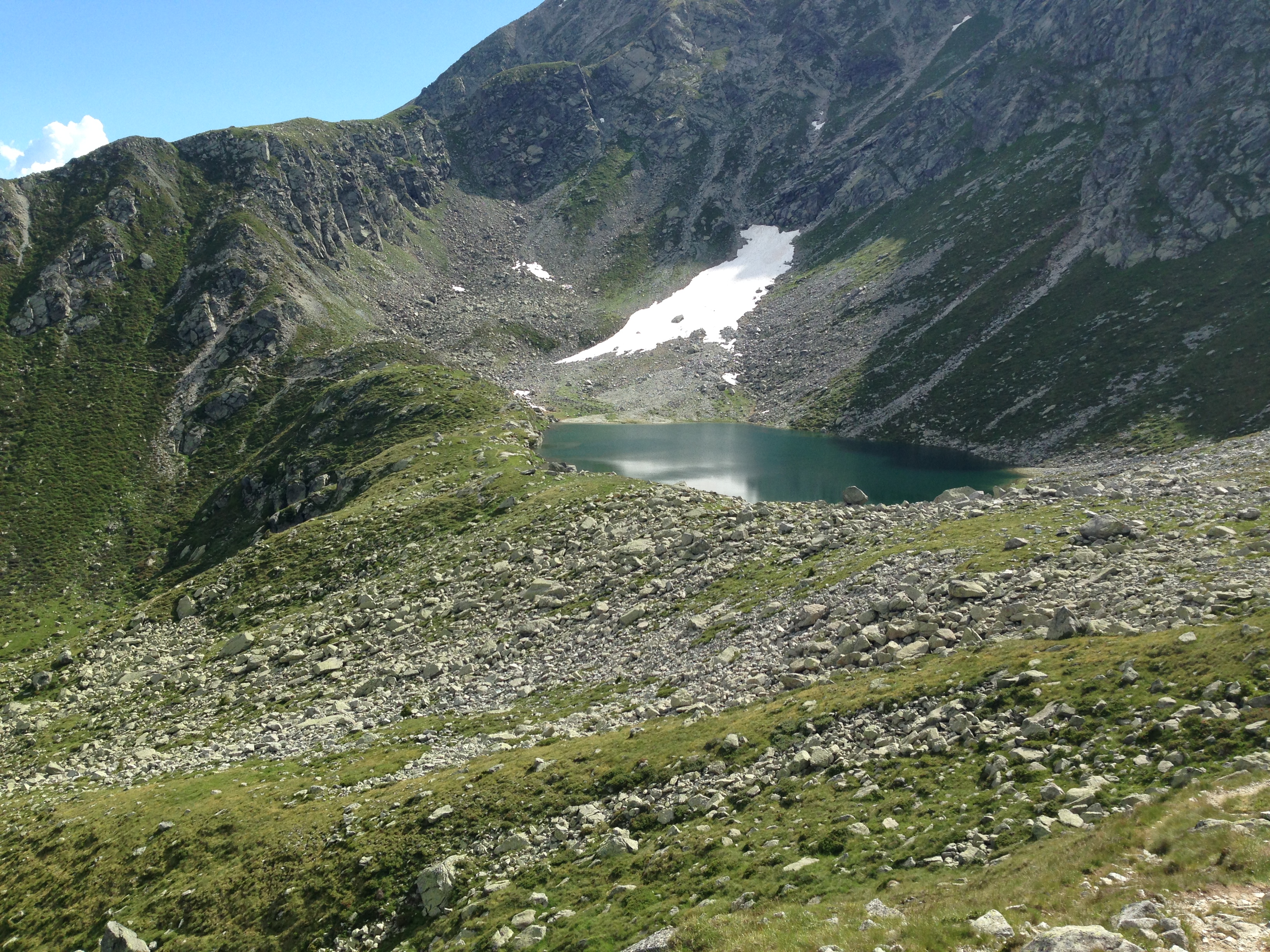 Auf der Wanderung hierher hatte ich schon diverse „ausgesetzte Passagen“ gemeistert, diese waren an den steilsten und absturzgefährdeten Stellen allerdings alle seilversichert gewesen. Hier ging es 100m steil nach oben und keine Sicherung weit und breit. Also wurden die Stöcke weggepackt und mitsamt dem Rucksack musste ich mich mit den Händen von Fels zu Fels ziehen und gleichzeitig immer einen sicheren Tritt finden. Ein Ausrutschen hätte fatale, wenn nicht tödliche Folgen haben können. Auf der Scharte oben angekommen hatte ich wirklich „weiche Knie“ und musste erst einmal zwei Zigarettenlängen pausieren.