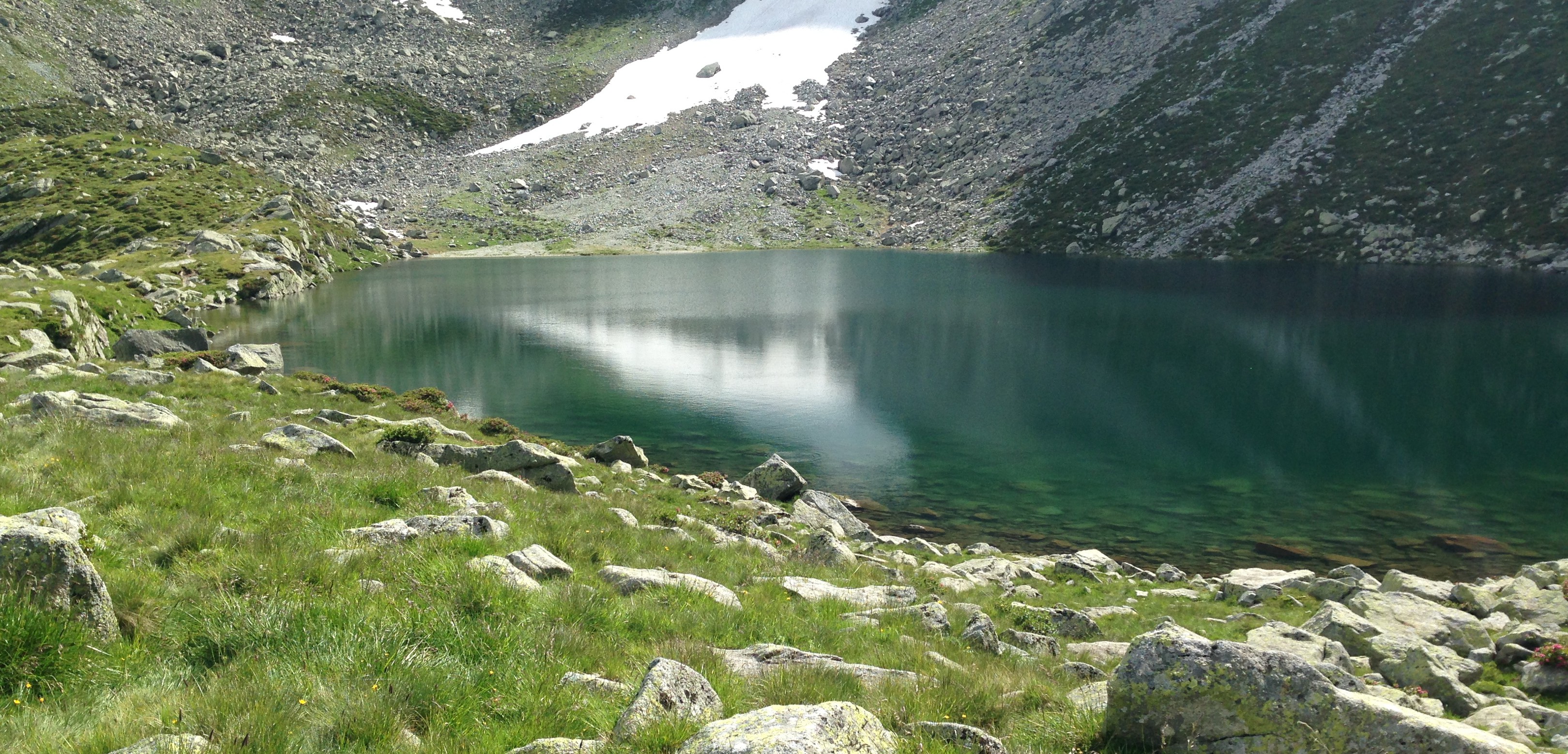 Knapp die Hälfte des Weges lag jetzt noch vor mir. Der Abstieg über Geröllfelder führt zu zwei Seen an denen Haflinger Pferde anzutreffen waren. Vom dort führt der Weg in leichtem Auf und Ab in Richtung des Kratzberger Sees. Der See liegt wunderschön einbettet und ist ein optimaler Rastplatz. Langsam schwinden die Kräfte und nach einer weiteren Strecke einer Bergflanke entlang möchte man eigentlich die Meraner Hütte zumindest sehen oder erkennen. Aber auch dieser Wunsch erfüllt sich erst nach der Bewältigung von weiteren drei Bergflanken. Und um noch eins draufzusetzen werden die letzten 20 Minuten zur Meraner Hütte auf spitzen Steinstufen zurückgelegt.