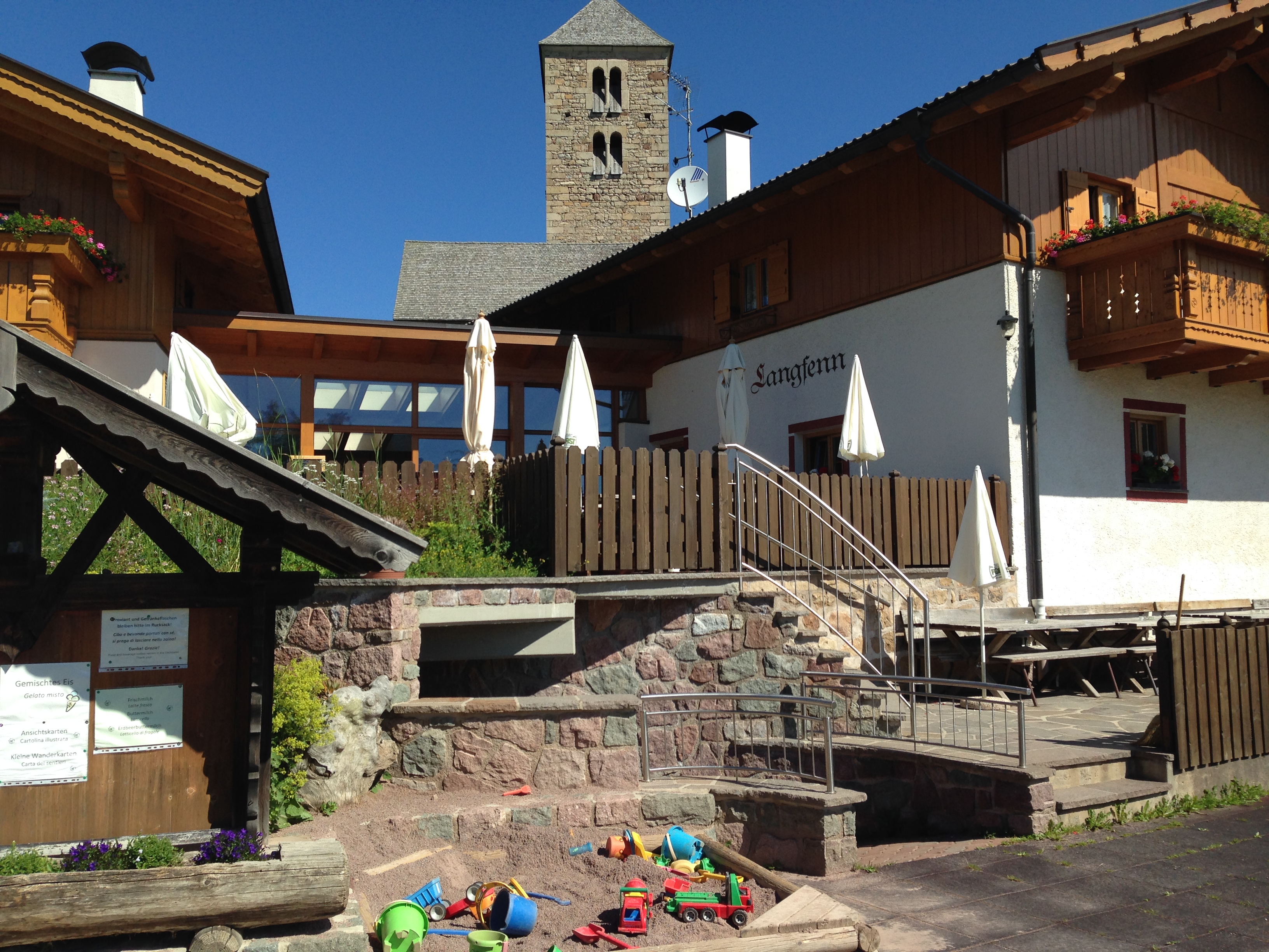 Langfenn bietet sich zum rasten an und einen Kaffee zu geniessen, bevor es dann idyllisch an Weidenzäunen und Pferdegattern vorbeigeht. Rechts und links des Weges sieht man nichts als kilometerlange Weiden auf denen gerade Stroh gemacht wird. Ab und an kommen Reiter auf Haflingern vorbei. Immer wieder kann der Blick schweifen auf die Berge der Umgebung, sei es die Sellagruppe, Langkofel und Plattkofel etc.