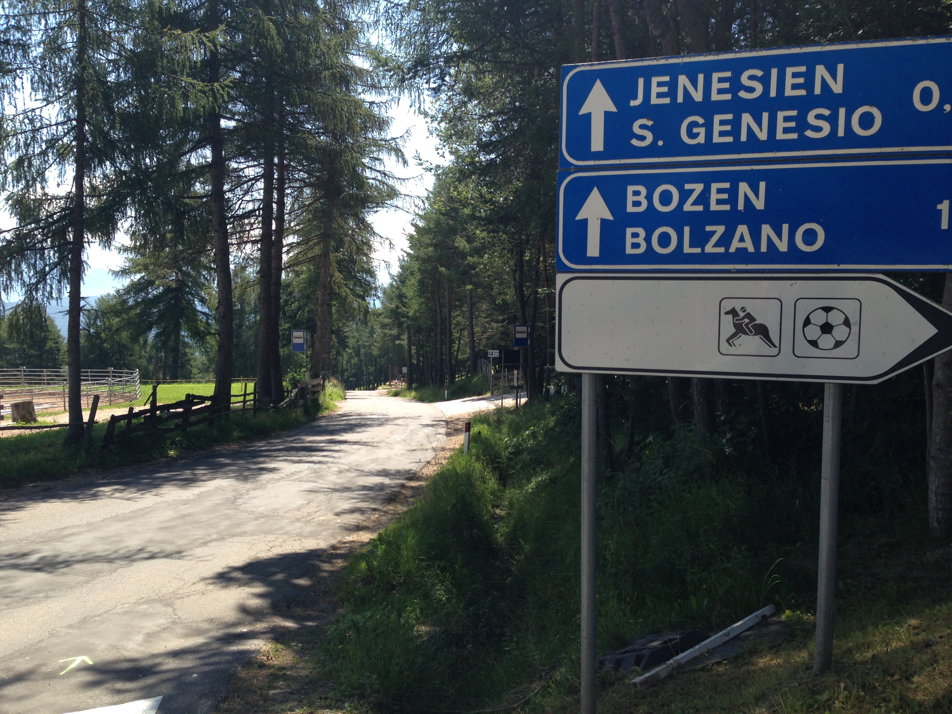 Kilometer um Kilometer nähert man sich Jenesien und nach dem Gasthof Edelweiß ist das Ziel fast erreicht. Es geht noch steil ein Waldstück hinunter und der Weg endet quasi an der Bushaltestelle. Ich erreiche Jenesien allerdings kurz nach 12 Uhr Mittag und wie es in Italien üblich ist, ist auch für den Busverkehr erst einmal Mittagsruhe angesagt.